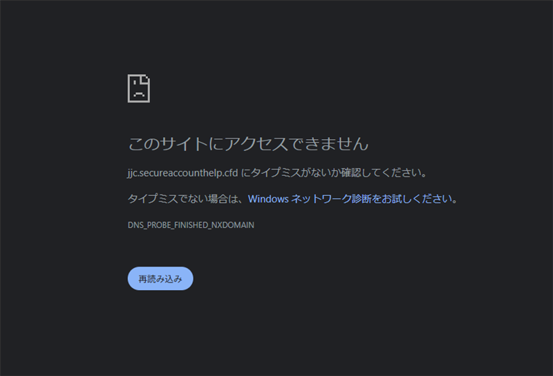 | リンク先サイト(詐欺サイト)の正体 本文中のURLは偽装されており、クリックすると以下の全く別のドメインへ誘導されます。 | 誘導先ドメイン | jjc.secureaccounthelp.cfd | | 偽装URL | hXXps://jjc.secureaccounthelp.cfd/v5/hiung/jjclogin?track=518541… (※伏せ字を含みます) | | IPアドレス | 104.21.53.181 | | 設置国 / ホスト | United States (US) / Cloudflare | | ドメイン登録日 | 2026-02-20(攻撃のわずか7日前に取得) | 【専門考察】 ドメインが直前に取得されているのは、セキュリティソフトのブラックリスト登録を回避するための典型的な手口です。短期間の「使い捨て」を目的としています。現在はウイルスバスター等で強力にブロックされており、アクセスすると「このサイトにアクセスできません」というエラーが表示されます。 >> リンク先IP(104.21.53.181)の解析エビデンス詳細