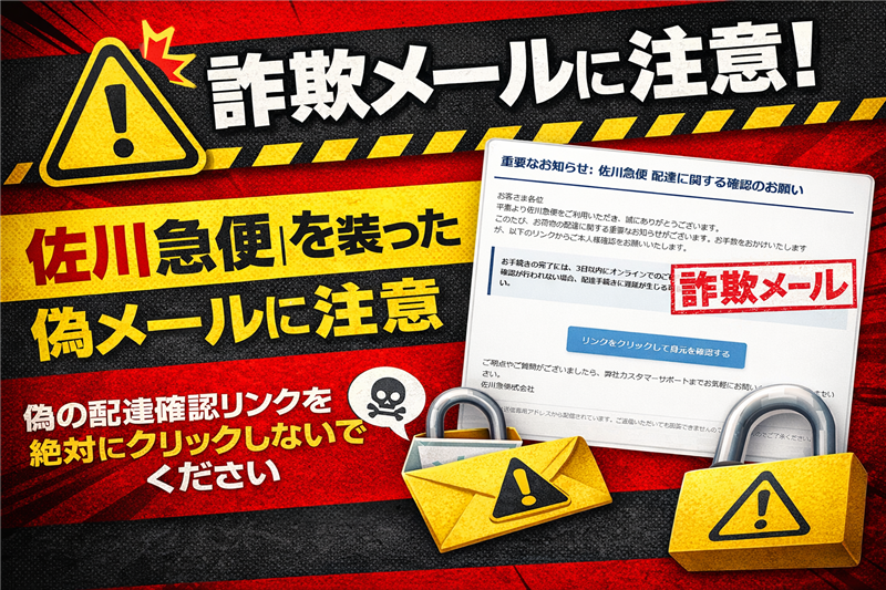 ■ メールの内容(画像再現) ※できる限り忠実に再現していますが、本物の詐欺メールとデザインが異なる場合もあります。 重要なニュース:佐川急便 配達に関する確認のお願い お客さま各位 平素より佐川急便をご利用いただき、誠にありがとうございます。 このたび、お荷物の配達に関する重要なお知らせがございます。お手数をおかけいたしますが、以下のリンクからご本人様確認をお願いいたします。 | お手続きの完了には、3日以内にオンラインでのご確認をお願い申し上げます。期限内に確認が行われない場合、配達手続きに遅延が生じる可能性がございますのでご注意ください。 | ご不明点やご質問がございましたら、弊社カスタマーサポートまでお気軽にお問い合わせください。 佐川急便株式会社 本メールは送信専用アドレスから配信されています。ご返信いただいても回答できませんのでご了承ください。 公式サイト
