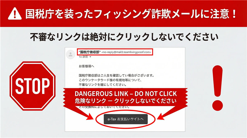 過去の国税庁偽装事例と比較しても、2026年版はより「差し押さえ」の切迫感を強調し、リンク先サイト(e-Tax偽装)の完成度も高まっています。しかし、送信元ドメインと誘導先URLを冷静に確認すれば、偽装を見破ることは容易です。