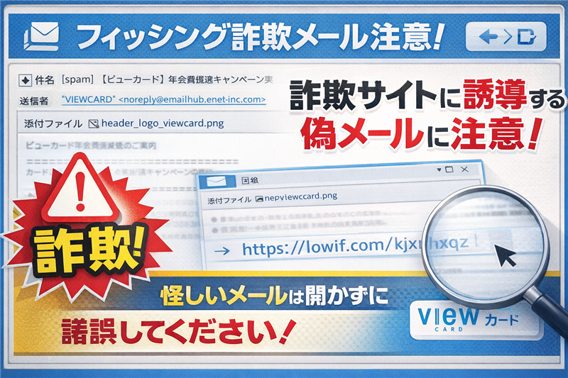 今回ご紹介するのは「ビューカード」を騙るメールですが、その前に最近のスパム動向について触れておきます。2026年現在、フィッシング詐欺は「アカウントの異常」を訴える手口から、今回のような「実益を伴うキャンペーン(年会費減免)」を装う形へとシフトしています。特に年度末や新生活シーズンには、クレジットカードの契約内容見直しを逆手に取った攻撃が多発しており、注意が必要です。