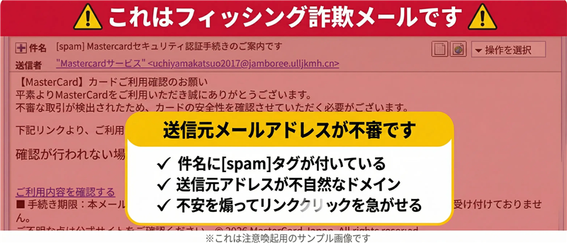 今回ご紹介するのは「Mastercard」を騙るメールですが、その前に最近のスパムの動向を解説します。2026年3月現在、新生活の準備に伴うクレジットカード利用の増加を狙った「アカウント凍結」や「不正利用確認」を装うフィッシングメールが急増しています。特にブランド名を騙りながらも、送信ドメインが全く無関係な「.cn(中国)」などから送られるケースが目立っており、自動生成されたランダムな英数字ドメインを使い捨てる傾向が強まっています。