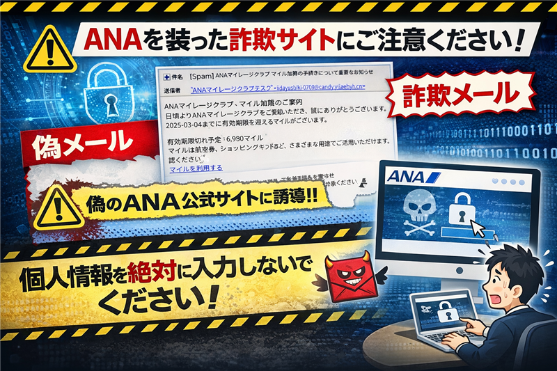 【調査報告】最新の詐欺メール解析レポート メールの解析結果と技術的エビデンスの提示 | 最近のスパム動向 今回ご紹介するのは「ANA」を騙るメールですが、その前に最近のスパムの動向を解説します。 現在、3月の年度末に向けた「マイルの有効期限」や「ポイント失効」を口実にしたフィッシング詐欺が非常に活発化しています。特に「2026-03-04までに失効」といった具体的な日付を提示し、ユーザーに焦りを与えて偽サイトへ誘導する手口が目立ちます。 | 解析対象メールの基本情報 | 件名 | [spam] ANAマイレージクラブ マイル加算の手続きについて重要なお知らせ | | 件名の見出し | [spam]判定 サーバー側のセキュリティフィルターが、送信元の不審な挙動を検知し自動的に付与した警告タグです。 | | 送信者 | “ANAマイレージクラブデスク” <iidayoshiki-0709@candy.yiaebyh.cn> | | 受信日時 | 2026-03-04 12:20 | 送信者解析: 送信者アドレスが個人のような文字列(iidayoshiki-0709)であり、さらにドメインが中国の「.cn」であることから、ANA(ana.co.jp)とは一切関係がない盗用アドレス、もしくは使い捨てのアドレスと判断できます。 | メール本文の完全再現 ※できる限り忠実に再現していますが、本物の詐欺メールとデザインが異なる場合もあります。 ANAマイレージクラブ – マイル有効期限のご案内 日頃よりANAマイレージクラブをご愛顧いただき、誠にありがとうございます。 2026-03-04までに有効期限を迎えるマイルがございます。 有効期限切れ予定マイル:6,980マイル マイルは航空券、ショッピング、ギフト券など、さまざまな用途でご活用いただけます。ぜひ下記リンクより詳細をご確認ください。 マイルを利用する(h××ps://bvztrqa.cn/g1/a2/h3/eq=ana/) ご確認がない場合、マイルが失効となる可能性がございますので予めご了承ください。【マイルのご利用例】 特典航空券への交換 ANAショッピング A-style での利用 提携ポイントやギフト券への交換 【注意事項】 有効期限を過ぎたマイルは失効いたします。 記載内容は2026年12月時点の情報です。 © 2026 All Nippon Airways Co., Ltd. All Rights Reserved. | | 専門的な解析と攻撃の目的 犯人の目的: このメールの主目的は、ANAの会員情報(お客様番号・パスワード)および、その後のフローで入力させるクレジットカード情報の窃取です。 メールデザインの特徴: 公式のロゴを模倣せず、テキストのみで構成されています。注目すべきはフッターの「2026年12月時点の情報です」という記述です。受信日の2026年3月よりも未来の日付が記載されており、非常に不自然です。 危険なポイント: 送信元のドメイン(candy.yiaebyh.cn)が公式(ana.co.jp)と完全に異なっている点、および宛名に受信者の氏名が入っていない点が、フィッシングメールを見抜く決定的なポイントです。 | Received(送信元)の回線解析レポート 本レポートの根拠データとなる、送信経由サーバーの情報です。 | Received情報 | from candy.yiaebyh.cn (unknown [62.201.248.6]) ※カッコ内のIPは信頼できる送信元データです。 | | 送信元IPアドレス | 62.201.248.6 | | 送信ホスト名 | candy.yiaebyh.cn | | ホスティング社 | EarthLink Telecommunications | | 設置国 | イラク (Iraq) | | ドメイン登録日 | 2026-02-28 ※送信のわずか数日前に取得されており、攻撃用ドメインであることが明白です。 | ≫ 送信元回線の詳細をip-sc.netで確認する | 誘導先URLおよび詐欺サイトの状態 | 誘導URL | h××ps://bvztrqa.cn/g1/a2/h3/eq=ana/ (リンク無効化のため伏せ字を含みます) | | リンク先IPアドレス | 104.21.31.189 | | リンク先ホスト名 | bvztrqa.cn | | ホスティング社 | Cloudflare, Inc. | | 国名 | アメリカ合衆国 (United States) | | ドメイン登録日 | 2026-03-01 ※メール受信の3日前に登録されています。 | サイトの状態: 現在、このサイトは「稼働中」ですが、特定のアクセスに対してはタイムアウトエラーを装う画面を表示します。これはセキュリティスキャンを回避するための偽装工作です。 ≫ リンク先サイトの回線解析をip-sc.netで確認する | 詐欺サイト(偽装エラー画面)の検証 ※アクセス時に表示される、偽のタイムアウト画面 | 総評と推奨される対策 今回の事例は、ドメイン登録から攻撃開始までの時間が非常に短い、計画的なフィッシングキャンペーンです。ANA公式サイトでも、マイルの有効期限を装った不審メールへの注意喚起が公開されています。 ≫ ANA公式サイトの注意喚起ページを確認する 対処法: メール内のリンクは絶対にクリックせず、破棄してください。マイルの確認が必要な場合は、必ず公式アプリや検索エンジンから公式サイトへ直接アクセスしてください。 | |
