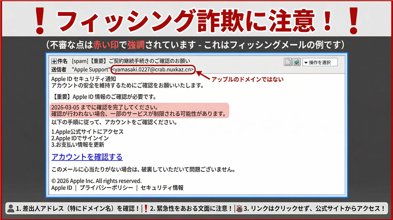 | ■ 受信メール解析結果 | 件名 | [spam] 【重要】ご契約継続手続きのご確認のお願い | | 件名の見出し | 冒頭の [spam] 表記は、メールサーバーのアンチスパムエンジンが既にこのメールを「危険」と判定したことを示す強力な警告サインです。 | | 送信者 | “Apple Support” <yamasaki.0227@crab.nuxkaz.cn> | | 受信日時 | 2026-03-05 12:03 | ※送信者アドレス yamasaki.0227@… は明らかに個人のもの、あるいは盗用されたドメインであり、受信者のアドレスをリストから盗用して機械的に送信していることを示唆しています。 | ■ 本文の再現と技術的解説 ※以下の枠内は受信したメールの内容をできる限り忠実に再現していますが、本物の詐欺メールとデザインが異なる場合もあります。 Apple ID セキュリティ通知 アカウントの安全を維持するためにご確認をお願いいたします。 【重要】Apple ID 情報のご確認が必要です。 2026-03-05 までに確認を完了してください。 確認が行われない場合、一部のサービスが制限される可能性があります。 以下の手順に従って、アカウントをご確認ください。 1.Apple公式サイトにアクセス 2.Apple IDでサインイン 3.お支払い情報を更新 アカウントを確認する このメールに心当たりがない場合は、破棄していただいて問題ございません。 © 2026 Apple Inc. All rights reserved. Apple ID | プライバシーポリシー | セキュリティ情報 | | ■ 解析結果:犯人の目的と手法 犯人の目的: Apple IDの資格情報(ID・パスワード)と、それに紐づくクレジットカード情報等の「金銭的価値のある個人情報」を窃取することです。 専門的解説: このメールはAppleの公式通知を装っていますが、宛名が記載されておらず、非常に事務的な文体です。最も不自然な点は、送信者アドレスに中国のドメイン(.cn)が含まれている点、および「本日中」という極端に短い期限を設定して受信者の冷静な判断を奪おうとしている点です。署名欄の体裁だけを整え、信頼感を与えようとする心理的誘導(ソーシャルエンジニアリング)が見て取れます。 | ■ 送信元(Received)通信解析 メールヘッダーから抽出した送信元の物理的経路情報です。カッコ内のIPアドレスは、送信に使用された信頼できる記録データです。 | 送信ドメイン | crab.nuxkaz.cn | | 送信IPアドレス | 202.37.47.87 | | ホスト/ISP名 | Beijing Baidu Netcom Science and Technology Co., Ltd. | | サーバー設置国 | China (CN) | | ドメイン登録日 | 2026-02-28 (Whois情報より。攻撃開始のわずか数日前に取得された、使い捨ての悪質ドメインです。) | 【本レポートの根拠データ】 送信元メール回線関連情報の詳細解析(ip-sc.net) | ■ 誘導先リンクの危険性解析 | リンク箇所 | 本文中「アカウントを確認する」 | | リンク先URL | https://kvwyk●b.cn/a2/g1/asd=icloudtiaos/ (※悪用防止のため一部伏字) | | セキュリティ検知 | 現時点でウイルスバスターやGoogle等でのブロックが確認されておらず、非常に危険な状態です。 | | リンクドメイン | kvwykeb.cn | | IPアドレス | 104.21.31.114 | | ホスティング社名 | Cloudflare, Inc. (bc.googleusercontent.comを含む中継経路を使用) | | 設置国 | United States (US) | | ドメイン登録日 | 2026-03-01 (攻撃の直前に準備されています。登録者が不明であり、追跡を逃れる意図が明白です。) | 【本レポートの根拠データ】 サイト回線関連情報の詳細解析(ip-sc.net) | ■ リンク先サイトの状態と証拠 現在、このサイトは稼働中ですが、以下のようなエラーページを表示させることが確認されました。 | Sorry, your request timed out. Please try again or check your internet connection. | これは「解析逃れ」のテクニックであり、特定の国やモバイル環境以外からのアクセスをエラーに見せかける偽装工作です。Googleのクローラーやセキュリティ担当者の目を欺くために実装されています。過去のApple詐欺事例と比較しても、より隠蔽性が高まっています。
