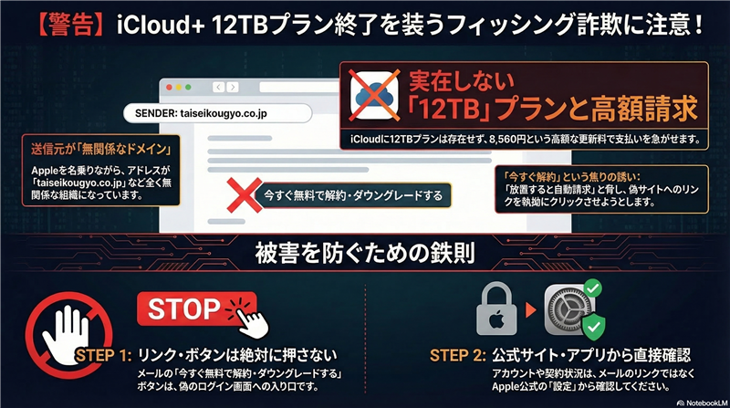 Appleを騙る「iCloud+ 12TB」詐欺メールを徹底解析!偽タイムアウト画面の正体とは