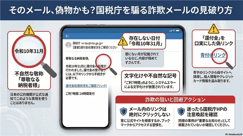 ■ 最近のスパム動向 現在、税制改正や確定申告時期に合わせて「国税局」や「e-Tax」を騙るフィッシング詐欺が非常に活発化しています。特に「払い戻し金(還付金)」という言葉で受信者の関心を惹き、偽のログインサイトへ誘導してクレジットカード情報や個人情報を盗み出す手口が主流です。今回の事例は、実在しない日付(令和10年31月)を使用するなど、稚拙ながらも心理的な焦りを煽る構成となっています。