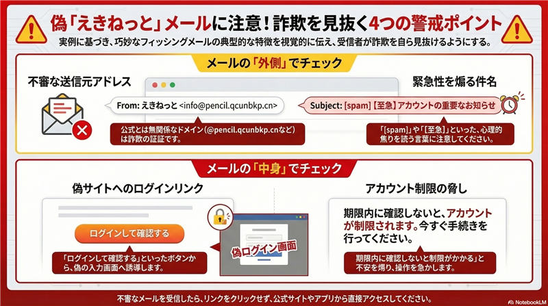 ■ 犯人の目的と偽者を見抜くポイント 【犯人の目的】 最大の目的は、偽のログイン画面を通じて「えきねっとユーザーID」「パスワード」および「クレジットカード詳細情報(番号・有効期限・セキュリティコード)」を盗み取ることです。盗まれた情報は即座に不正決済に利用されるか、ダークウェブで転売されます。