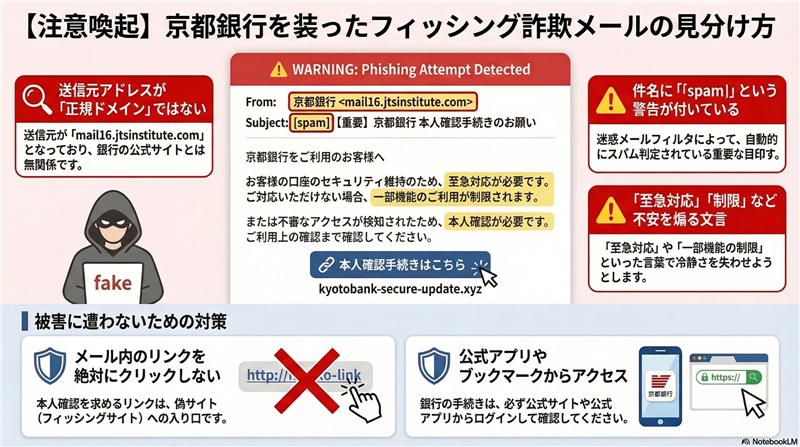 | メール受信解析データ | 件名 | [spam] 【京都銀行】ご本人様確認未完了のため至急対応をお願いします | | 件名の見出し | 「[spam]」という表記は、プロバイダ等の迷惑メール検知システムが危険と判断した際に自動で挿入するタグです。これが付いている時点で詐欺確定と判断して問題ありません。 | | 送信者 | “京都銀行” <neyywd@mail16.jtsinstitute.com> | | 受信日時 | 2026-03-12 1:24 | | メール本文の忠実再現 ※できる限り忠実に再現していますが、本物の詐欺メールとデザインが異なる場合もあります。 京都銀行 インターネットバンキング本人確認手続きのお願い 平素より当サービスをご利用いただき、誠にありがとうございます。 お客様のアカウントにおいて、現在 本人確認手続きが未完了 の状態であることを確認しております。 安全にサービスをご利用いただくため、下記ボタンよりお手続きをお願いいたします。 ご案内内容 ・本人確認情報の確認 ・登録内容の最新化 ・継続利用に必要な認証手続き 本人確認を開始する(リンク先:https://kyotaonlinae.c●m/ib/index.do/CCT0081) お手続きが完了していない場合、セキュリティ保護の観点から 一部機能のご利用が制限される場合 がございます。 また、確認状況に応じてサポート窓口より追加の確認をご案内する場合がございます。 ※本通知にお心当たりがない場合は、このメールを破棄してください。 ※本メールは送信専用のため、返信によるお問い合わせには対応しておりません。 お問い合わせ カスタマーサポート窓口 受付時間:平日 9:00〜17:00 このメールは配信専用アドレスより送信されています。 返信いただいてもご案内いたしかねますので、あらかじめご了承ください。 | | 犯人の目的と専門的解説 【犯人の目的】 このメールの主目的は、京都銀行の顧客から「店番」「口座番号」「ログインパスワード」および「暗証番号」を搾取することです。最終的には不正送金を行い、資産を奪うことを狙っています。 【専門的な異常ポイント】 ・送信ドメインの不一致: 送信アドレス `jtsinstitute.com` は京都銀行(kyotobank.co.jp)とは一切関係がありません。 ・署名の欠如と不完全さ: 銀行からの公式な通知には必ず「本店所在地」や「具体的な電話番号」を含む正式な署名がありますが、本メールには一切ありません。 ・ロゴの不在: テキストのみの簡素な構成であり、プロのデザイナーが介在する正規メールとは品質が著しく異なります。 | Received:送信元情報の詳細解析 以下のデータは、メールヘッダーから抽出した「攻撃者が実際に利用した回線情報」です。 | 送信元IPアドレス | 151.227.216.43(信頼できる送信元情報) | | 送信ドメイン | smtp.reserve-enrollment.or.jp | | ホスティング社名 | Vocus Communications | | 設置国名 | オーストラリア (Australia) | | ドメイン登録日 | 2025-11-20 | | 解析根拠データ | https://ip-sc.net/ja/r/151.227.216.43 | | リンク先(詐欺サイト)の解析結果 | 誘導URL | https://kyotaonlinae.c●m/ib/index.do/CCT0081 ※安全性確保のため伏せ字を含みます | | ドメイン名 | kyotaonlinae.com | | サイトIPアドレス | 104.21.XX.XX | | ホスティング社名 | Cloudflare, Inc. | | 設置国名 | アメリカ合衆国 (United States) | | ドメイン登録日 | 2026-03-10 ※攻撃開始の2日前に取得。典型的な「使い捨てドメイン」です。 | | サイト回線詳細 | https://ip-sc.net/ja/r/kyotaonlinae.com | | リンク先サイトの現状(エビデンス) 調査時点で、この詐欺サイトは既にアクセス不能、または閉鎖されています。  エラーコード:`DNS_PROBE_FINISHED_NXDOMAIN` これはドメインが既に無効化されたか、攻撃者がサーバーを撤去したことを示しています。しかし、別のドメインで同様のサイトが再構築される可能性があるため、油断は禁物です。