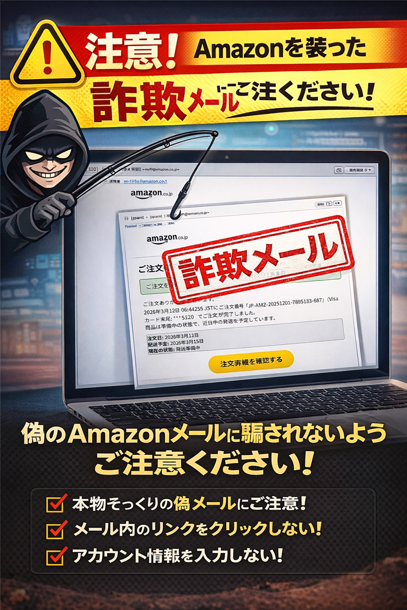 【調査報告】最新の詐欺メール解析レポート 大規模Amazon偽装キャンペーンの検知と技術的分析 | ■ 最近のスパム動向 今回ご紹介するのは「Amazon」を騙るメールですが、その前に最近のスパムの動向を解説します。2026年3月現在、Amazonの利用者層を標的とした極めて大規模なフィッシング攻撃が確認されています。昨夜から今朝にかけてのわずか数時間で、分単位の波状攻撃が仕掛けられており、一般の利用者だけでなくセキュリティフィルターを掻い潜るための多様な件名バリエーションが投入されているのが特徴です。 | 【当センターにおける受信ログの可視化】 ■ 観測データ:短時間に集中する詐欺メール群  ▼ 本解析で確認された主な偽装件名リスト(検索用インデックス) * [spam] ● A m a z o n プライム:カード情報の更新 * [spam] 【事務局】プライム会費の承認エラーについて * [spam] Amazon.co.jp:支払い方法の更新が必要です * [spam] Amazon.co.jp:アカウント設定の確認依頼 * [spam] Amazon:お支払いカードの期限切れの可能性 * [spam] Amazon:Payment Declined Notification * [spam] Amazon P r i m e:決済エラーのお知らせ * [spam] プライム会員:お支払い方法の確認 * [spam] プライム会員の会費に関する大切なお知らせ * [spam] 会費600円(税込)の決済不備について * [spam] 決済確認エラー:照会番号 TL-16550351283 * [spam] 請求先情報の更新をお願いします * [spam] 【重要】お支払い情報の確認が必要です(プライム会員更新)No.196908 * [spam] 【重要】ご注文確認のお知らせ * [spam] JCBカードご利用内容の確認 | | 上記画像は、2026年3月12日夜から13日早朝に受信したメールの一覧です。わずか数分の間に「ご注文確認」「カード情報の更新」「決済エラー」など、複数の異なる件名でAmazonを装うメールが届いていることが分かります。これは攻撃者が自動化された送信システムを使用し、網羅的に標的へ送りつけている決定的な証拠です。 上記のように、わずか数時間の間に多種多様な件名が使い分けられています。特に「A m a z o n」のように文字間にスペースを入れる手法は、機械的なスパム検知を回避するための古典的かつ悪質な工夫です。 | | | ■ 偽装メールの識別情報(解析対象) | 対象の件名 | [spam] 【重要】ご注文確認のお知らせ | | 件名の見出し | 件名に含まれる「[spam]」という表記は、メールサーバーが過去の攻撃パターンや送信ドメイン認証の失敗を検知し、受信者に注意を促すために動的に付与した警告ラベルです。 | | 送信者 | “Amazon” <v0l1n@amazon.co.jp> | | 受信日時 | 2026-03-12 20:33 | | 送信者の特徴 | 送信者アドレスの「v0l1n」という文字列は、正規のAmazonシステムでは絶対に使用されない無意味なコードです。受信者のメールアドレスが流出し、その一部を加工して送信元に偽装(なりすまし)している可能性が極めて高いと判断されます。 | ■ 偽装メールの本文(技術的再現) | ※できる限り忠実に再現していますが、本物の詐欺メールとデザインが異なる場合もあります。 ご注文確認のお知らせ ご注文ありがとうございます。 2026年3月12日 06:44:25 JSTにご注文番号「JP-AMZ-20251201-7895183-687」(Visaカード末尾: ***512)でご注文が完了しました。 商品は準備中の状態で、近日中の発送を予定しています。 注文日: 2026年3月12日 配送予定: 2026年3月15日 現在の状態: 発送準備中 | この注文に心当たりがない場合は、下のボタンをクリックしてアカウントにログインし、アカウントの安全を確認してください。 ————————————————————————- ・注文状況を確認する方法は? アカウント設定の注文履歴でご確認ください。 ・配送予定の詳細は? 注文詳細ページで最新情報をご確認いただけます。 ・注文を変更できますか? 発送前であれば、注文履歴から変更可能です。 ・サポートが必要ですか? カスタマーサポート(0120-999-373)またはヘルプページまで。 Amazon.co.jpでのご注文をありがとうございます。 ご不明な点はカスタマーサポートまでお問い合わせください。 Amazon.co.jp いつも、笑顔を。 このメールは no-reply@amazon.co.jp から送信されています。©2025 Amazon.com. All rights reserved. Amazon.co.jp は Amazon.com, Inc. の商標です。 お客様の情報は暗号化されています。 プライバシーポリシー | メール配信停止 送信者:アマゾンジャパン合同会社 カスタマーサポート:0120-999-373 | | ■ メールの目的及び感想 【犯人の目的】 攻撃の主目的は、偽のログインサイトへ誘導してID、パスワード、およびクレジットカード情報を直接入力させ、これらを奪い取ることです。「注文が勝手にされた」という不安感を煽ることで、受信者に冷静な確認作業をさせず、偽サイトへ誘導する心理的なトラップ(ソーシャルエンジニアリング)が仕掛けられています。【専門的な解説と違和感】 メールのデザイン自体は極めて精巧ですが、署名欄の電話番号(0120-999-373)はAmazonの正規カスタマーサポートのものであるものの、メール全体の著作権表記(©2025)が2026年の現時点と矛盾しています。本物の情報を一部混ぜ込む