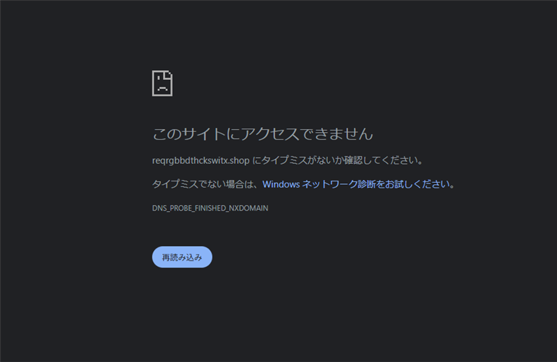 リンク先サイトの現在の状態 [実例:アクセス制限画面]  現在、このサイトは「DNS_PROBE_FINISHED_NXDOMAIN」エラーとなり稼働していません。これは、Googleやセキュリティベンダーによって危険なサイトとしてマークされ、ドメインが凍結されたか、犯人側が証拠隠滅のために閉鎖した可能性が高いことを示しています。 |