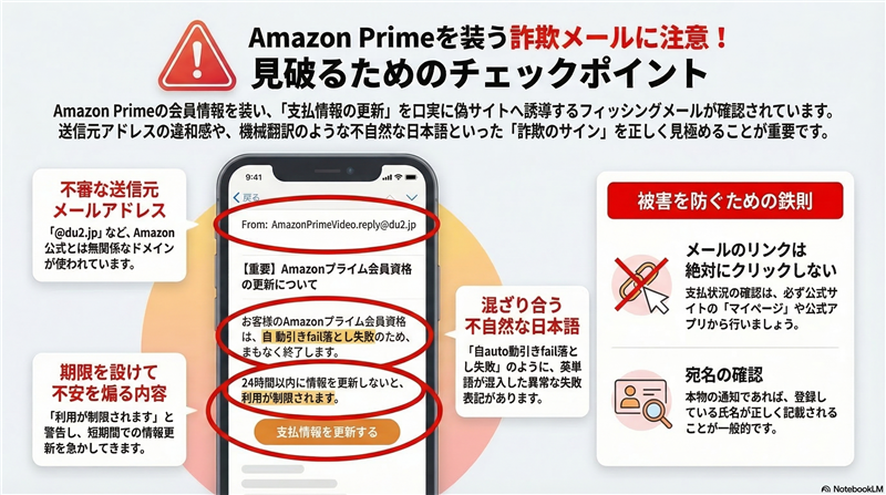 SECURITY INTELLIGENCE REPORT REPORT ID: AMZ-PHISH-20260314 / STATUS: ACTIVE THREAT | ■ 最近のスパム動向と前書き 今回ご紹介するのは「Amazon」を騙るフィッシングメールですが、その前に最近のスパムの動向について解説します。2026年現在、攻撃者はAIを用いた自然な日本語生成だけでなく、あえて「難読化」を施すことでセキュリティソフトを回避する手法へシフトしています。特に「自auto動引きfail落とし」といった異常な文字列の混入は、機械学習フィルタを突破するための最新のトレンドとなっており、注意が必要です。 | | 件名 | [spam] ご指定のカードが承認されませんでした(Ref: sGSYhf) ※見出しに[spam]とあるのは、受信サーバーがSPF/DKIM/DMARC等の送信ドメイン認証に失敗し、危険なメールとしてフラグを立てたためです。 | | 送信者 | “◆Amazon Prime ” <AmazonPrimeVideo.reply@du2.jp> ※送信ドメイン「du2.jp」はAmazonの正規ドメインとは一切無関係な盗用・偽装アドレスです。 | | 受信日時 | 2026-03-13 21:31 | ■ 検体本文の忠実な再現 ※できる限り忠実に再現していますが、本物の詐欺メールとデザインが異なる場合もあります。 Amazon.co.jp – Prime-ご指定のカードが承認されませんでした(Ref: sGSYhf) ◯◯◯◯ 様 いつもご利用いただき、ありがとうございます。 お客様の Prime 会費のお支払い状況を確認したところ、正常に決済が完了しておりません。 決済日時: 2026年03月13日 (金) 21:31:51 お支払方法: カ_ー_ド(末尾:4384) 決済状況: 自auto動引きfail落とし失敗 このままの状態では、配送特典や Prime Video 等の特典利用が制限されます。 お手数ですが、2026年03月15日 (日) までに、お支払い情報を更新してください。 発行: Amazon Japan G.K. | セキュリティ番号: Xei7gVLz Seed: Wj4ATF | JST: 21:31:51 | Hash: yoxlb1NvfI6242