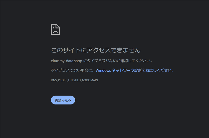 サイトの状態: 現在は「このサイトにアクセスできません(DNS_PROBE_FINISHED_NXDOMAIN)」と表示され、稼働を停止しています(画像参照)。これは、悪事が露見してドメインが凍結されたか、犯人が証拠隠滅のためにサイトを閉鎖した典型的な挙動です。
