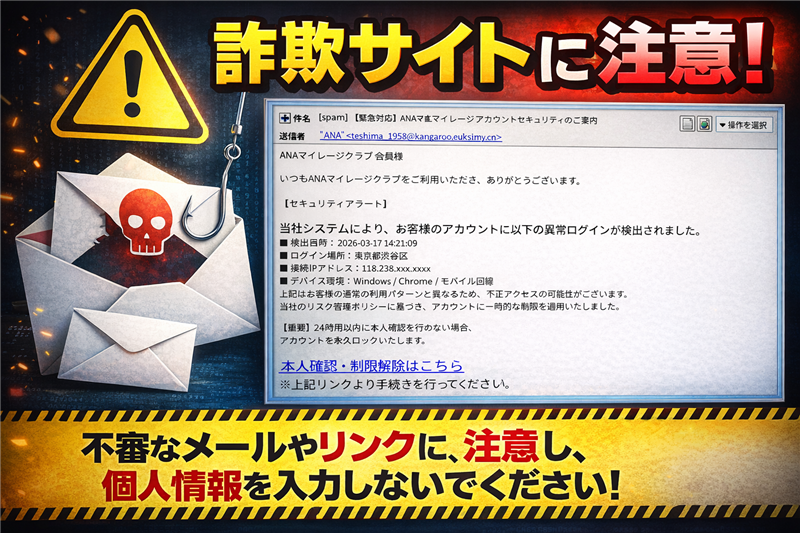 | ■ 危険回避のための対処法 過去の事例と比較しても、本文中に「異常ログインの場所」や「IPアドレス」を具体的に記載して信憑性を高める手法が継続されています。しかし、ANAが .cn ドメインからメールを送ることは100%ありません。 不審なメールを受け取った場合は、メール内のリンクは決して開かず、必ず公式URLからログインして状況を確認してください。 ▼ ANA公式サイトによる注意喚起ページ(正確なURL) |