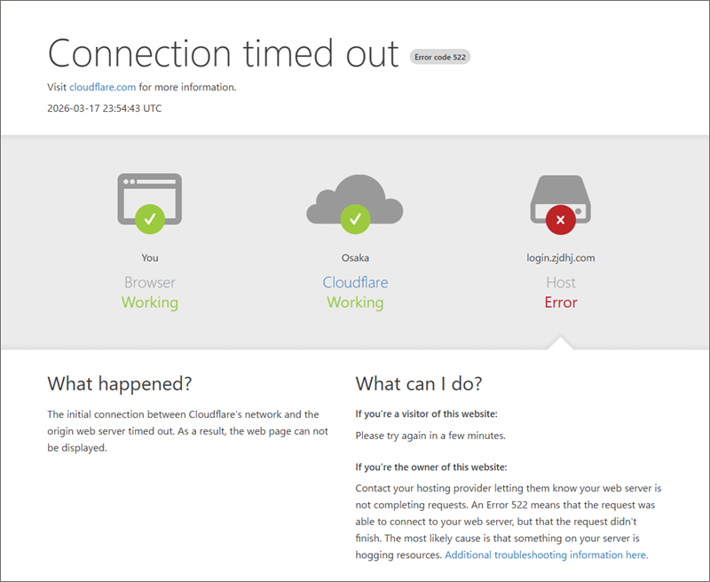 【サイトの状態】 調査時点では、ブラウザからはブロックされませんでしたが、Cloudflareによる「Error 522 (Connection timed out)」が表示されました。これは詐欺サイトのサーバー側が過負荷、または通報を恐れて一時的に応答を止めている状態を示唆しています。