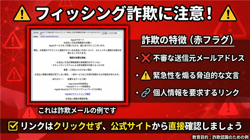 2026年現在、Appleのブランド刷新(Apple IDからApple Accountへの移行)に乗じた詐欺が急増しています。特に「お支払い方法の再確認」という名目は、ユーザーの焦りを誘いやすく、年度末やサブスクリプションの更新時期に合わせて大量配信される傾向にあります。