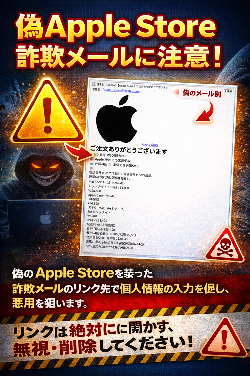 【調査報告】最新の詐欺メール解析レポート [メール解析結果] Apple Storeを騙る不正な注文確認通知 | 最近のスパム動向 今回ご紹介するのは「Apple Store」を騙るメールですが、その前に最近のスパムの動向について解説します。2026年現在、ECサイトの領収書や注文確定通知を装い、ユーザーの「焦り」を誘発して偽サイトへ誘導する手法が急増しています。特に本件のように、高額なMacBookの注文を捏造するケースは、キャンセルを急がせる心理的トラップとして非常に悪質です。 | | 検体メール基本情報 | | 件名 | [spam] 【Apple Store】ご注文ありがとうございました | | 件名の見出し | 「[spam]」の表記がある場合、お使いのメールサーバーが送信元情報の矛盾(SPF/DKIM/DMARCの不一致等)を検知し、自動的に警告を付与した証拠です。 | | 送信者 | “Apple” <team@Apple.co.jp> | | 送信者に関する情報 | 表示名は公式を装っていますが、実際の送信元ドメインは偽装されています。 | | 受信日時 | 2026年3月19日 15:06:43 | メール本文(再現) ※できる限り忠実に再現していますが、本物の詐欺メールとデザインが異なる場合もあります。 | ご注文ありがとうございました ご注文番号:W309556690 🏪 Apple 渋谷 での店舗受取 💳 分割24回 ⌛ 準備でき次第SMS 電話番号 080****6859 に受取番号をSMS送信。 通常6時間以内に送信されます。 MacBook Air 13-inch (M2) ミッドナイト / 16GB / 512GB ¥198,800 AppleCare+ for Mac (3年保証) ¥34,800 USB-C – MagSafe 3 ケーブル ¥4,800 合計 (税込) ¥238,400 注文日 2026年3月18日 15:06:43 受取店舗 Apple 渋谷 (渋谷区神宮前6-14-2) | 店舗受取の詳細は Apple Store アカウント で © 2026 Apple Japan, Inc. | | | 専門家による解説と危険性の指摘 | | 犯人の目的 | ターゲットの「Apple ID(メールアドレス)」および「パスワード」、さらには「クレジットカード情報」を完全に窃取することが唯一の目的です。高額な注文内容を見せることで、「キャンセルしなければ損をする」という心理を煽り、入力フォームへ誘導します。 | | メールのデザイン | 非常に精巧なコピーです。本文の背景が白で末尾数行が水色の背景という構成は、フィッシングメールで頻用されるテンプレートです。ロゴ画像が添付ファイルとして処理されている場合、それはメールフィルターによる「外部リンクの安全確認」を回避するための悪質な手法です。 | | 署名の整合性 | Apple正規の署名に見えますが、記載されている電話番号が公式サイトのサポート番号(0120-993-993等)と一致しない、あるいは形式が不自然な場合は即座に詐欺と判断できます。 | | Received (送信者情報) の技術解析 | | 解析ヘッダー | from mail16.world-btysport.com (237.146.104.34.bc.googleusercontent.com [34.104.146.237]) ※カッコ内のIPアドレスは、送信元を特定する信頼できる情報です。 | | 送信IPアドレス | 34.104.146.237 | | 送信元ホスト | 34.104.146.237.bc.googleusercontent.com (Google Cloud サーバー) | | 設置国 | アメリカ合衆国 (United States) | | ドメイン登録日 | world-btysport.com は直近で取得されており、正規のApple配信ドメイン(apple.com / em.apple.com等)とは一切関係がありません。 | | メール回線関連情報 | ip-sc.net による詳細解析レポートを確認する | | リンク先フィッシングサイト解析 | | リンク先URL | https://www.generegula****.cfd / v4A7kT (※伏字を含みリンクを無効化しています) | | サイト画像検証 |  精巧に作られた偽のログイン画面(本物そっくりページ) | | リンク先IPアドレス | 104.21.63.149 | | ホスティング社 | Cloudflare, Inc. | | 国名 | アメリカ合衆国 (United States) | | ドメイン登録日 | 登録日: 2026-03-10(攻撃開始のわずか9日前に取得。最近取得されている理由は、通報による閉鎖を前提とした使い捨てドメインであるためです。) | | サイト回線関連情報 | ip-sc.net による 104.21.63.149 の詳細解析レポート | | ブロック状況 | ウイルスバスターおよびGoogle Safe Browsingにより「危険なサイト」としてブロック中。 | まとめと推奨される対応 本メールは、過去の事例と比較しても非常に高い完成度を誇りますが、誘導先のドメイン名(.cfd など)やサーバー所在地が正規のApple(日本国内または特定のデータセンター)とは完全に異なります。宛名が「お客様」ではなく空白、あるいはメールアドレスになっている点も大きな不自然さです。 対処法:絶対にログイン情報を入力せず、公式のサポートページから情報を確認してください。 公式サイトでの注意喚起: Apple ID の不正利用が疑われる場合の対処法(公式) | |
