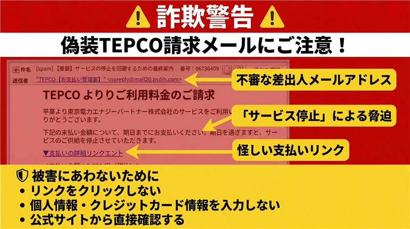 【調査報告】最新の詐欺メール解析レポート STATUS: 脅威分析完了 / 解析対象: 東京電力(TEPCO)偽装メール | ■ 最近のスパム動向 今回ご紹介するのは「東京電力(TEPCO)」を騙るメールですが、その前に最近のスパムの動向を解説します。2026年現在、生活インフラの停止を予告して心理的に追い詰める「督促型フィッシング」が極めて巧妙化しています。特に支払い期限を「本日中」や「延長不可」と設定し、冷静な判断力を奪う手法が一般的となっています。