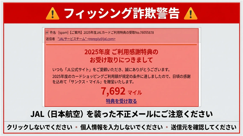 - 万が一クリックしてしまい、ログイン情報を入力した場合は、即座にJAL公式サイトからパスワードを変更し、カード会社へ連絡してください。