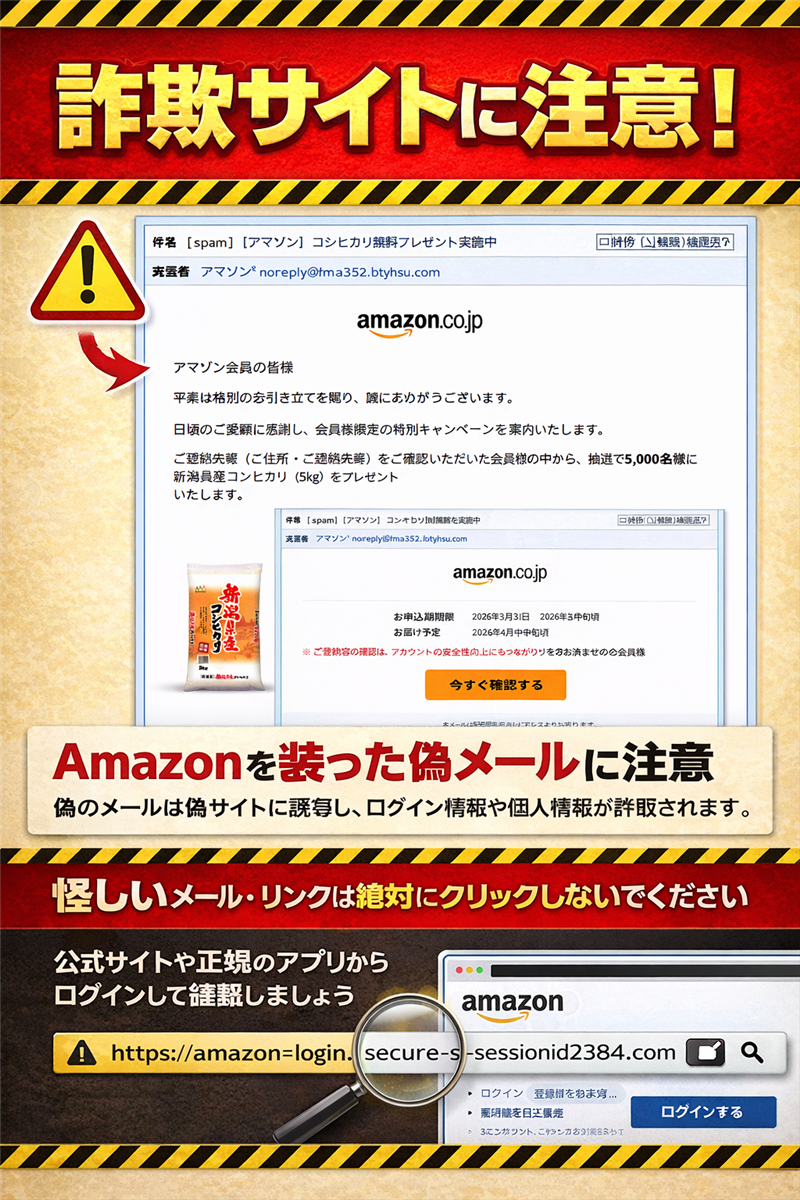 今回ご紹介するのは「Amazon」を騙るメールですが、その前に最近のスパムの動向を解説します。2026年3月現在、新生活シーズンや年度末のポイント失効を狙った詐欺が横行しており、特に「新潟県産コシヒカリ5kg」といった具体的かつ実用的な物品を餌にする手法が目立ちます。短時間に数十通ものメールを、件名を変えて送りつける「執拗な連投」により、受信者の判断力を奪う狙いがあります。