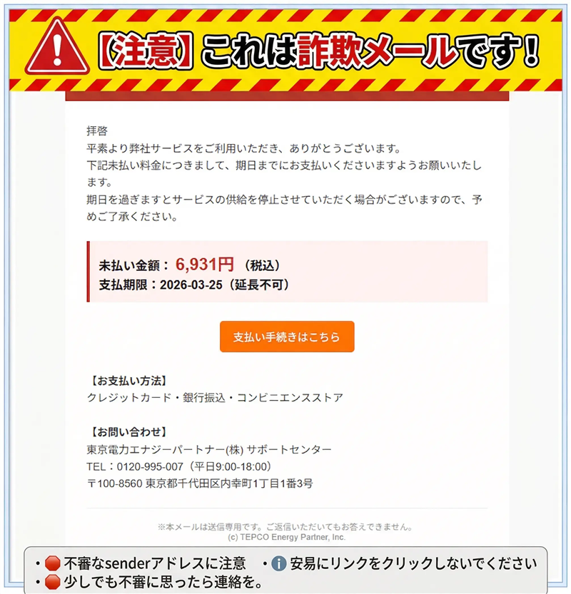 ■ 署名の検証(電話番号): 本文に記載されている「0120-995-007」は、東京電力エナジーパートナーの実際のカスタマーセンターの番号と一致 します。しかし、これは「信頼させるためのカモフラージュ」です。リンク先が偽物である以上、記載内容が一部正しくても、そのメール自体の安全性は保証されません。