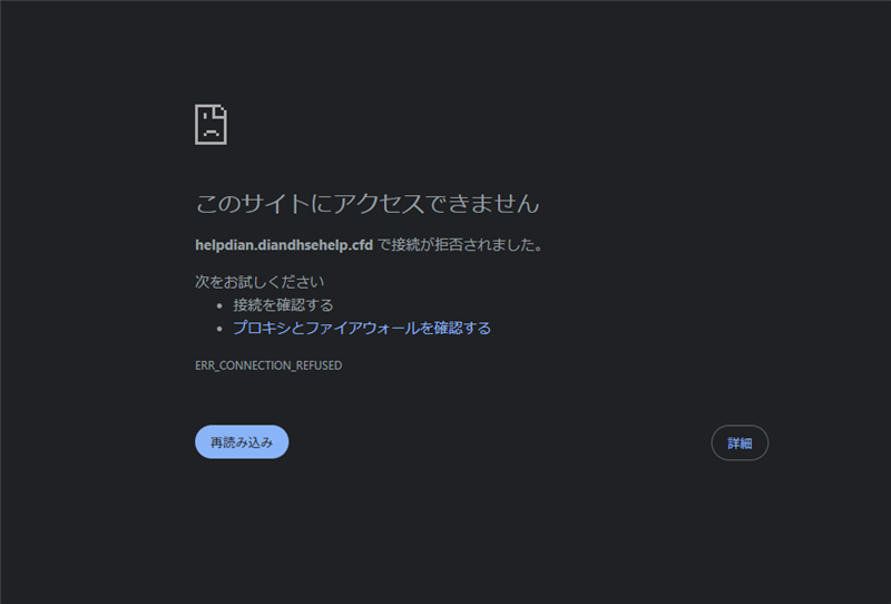 ▼リンク先のブロック・エラー画面(実例) このサイトにアクセスできません helpdian.diandhsehelp.cfd で接続が拒否されました。