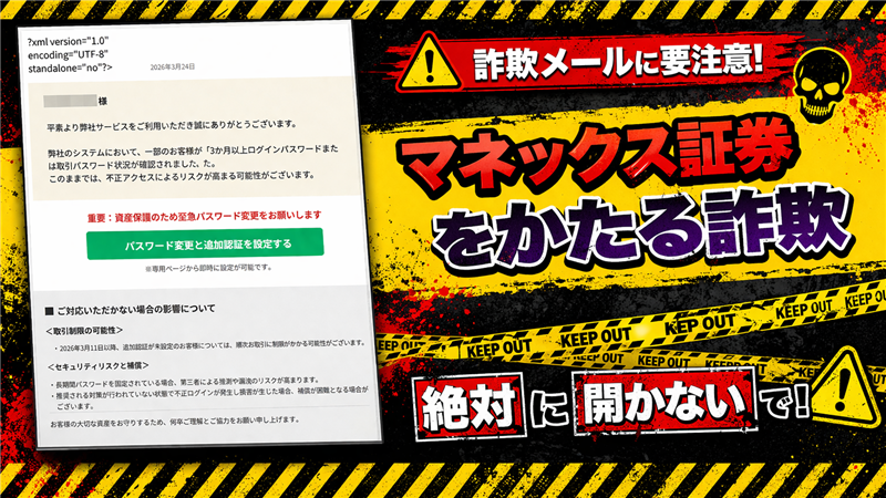 | ■ 総合評価と推奨される対応 【結論】 本メールは100%詐欺です。過去の事例と比較しても、本文の作り込みが非常に丁寧であり、「?xml…」のタグ漏れを除けば、一般の方が一目で見抜くのは困難です。このようなメールを受け取った場合は、メール内のリンクは絶対にクリックせず、ブラウザのブックマークや公式アプリからログインしてください。【公式サイトによる注意喚起】 マネックス証券公式でも、本件と同様の手口について注意を呼びかけています。 重要:マネックス証券を名乗る不審なメール・SMSにご注意ください | |
