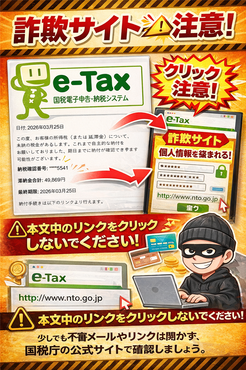 【詐欺】e-Tax「未納税金に関するお知らせ」49,869円は偽物!PayPay誘導に注意