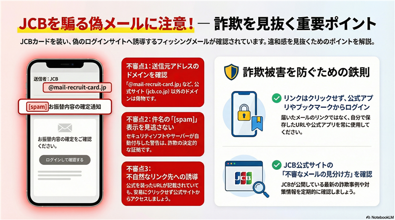 ・宛名が「お客様」など汎用的なものは疑う(JCBの公式メールは通常、氏名が記載されます)。