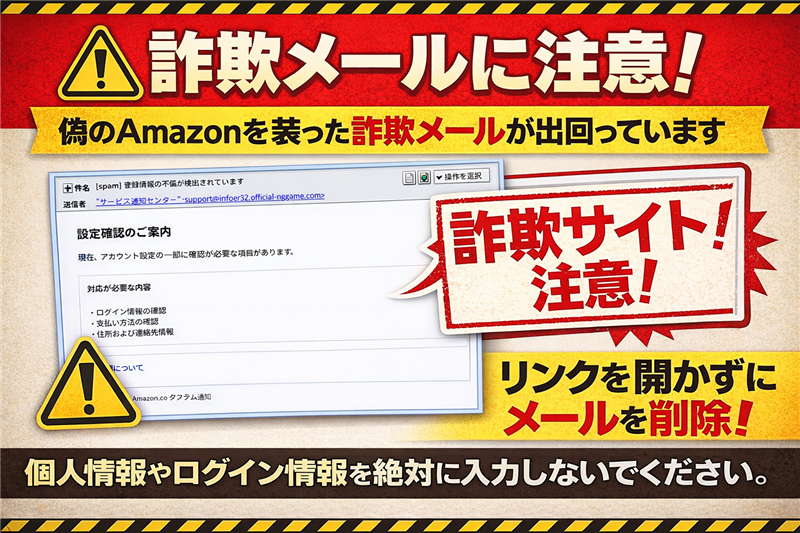 正規のAmazonからの通知は amazon.co.jp 等の公式ドメインから届きます。「official-nggame.com」は100%詐欺です。