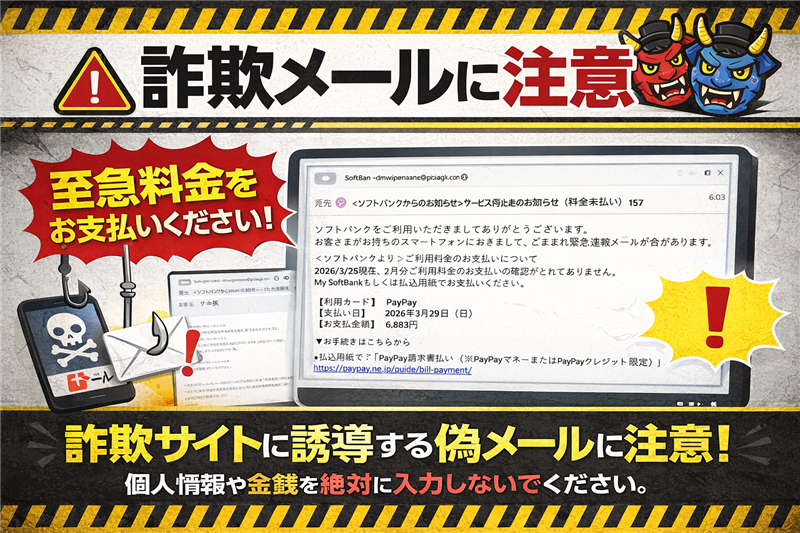 【調査報告】最新の詐欺メール解析レポート メールの解析結果と技術的エビデンスの記録 | 最近のスパム動向 今回ご紹介するのは「ソフトバンク」を騙るメールですが、その前に最近のスパムの動向を確認しておきましょう。 現在、「本物のリンクと偽物のリンクを混ぜる」という極めて巧妙な手口が増加しています。一部のリンクを公式サイト(paypay.ne.jp等)に設定することで、メール全体の信頼性を高め、セキュリティソフトの自動検知を回避しようとする狙いがあります。今回のケースも、後半のリンクは本物、肝心の「支払いボタン」だけが偽物という構成になっています。 | メール基本情報(検体データ) | 判定 | SPAM / PHISHING (詐欺メール) | | 件名 | <ソフトバンクからのお知らせ>サービス停止のお知らせ(料金未払い) 157 | | 送信者 | SoftBan <dm.wjirosne@pizqqk.cn> | | 受信日時 | 2026-03-28 06:03 | 送信元サーバーの正体 | 解析ステータス | from unknown (HELO pizqqk.cn) (101.47.5.48) | | 接続IPアドレス | 101.47.5.48 | | ホスト名 | static.vnpt.vn (ベトナム通信網) | | 設置国 | ベトナム (Vietnam) | カッコ内のIPアドレスは、このメールが実際に発信された場所を示す信頼できる送信者情報です。ソフトバンクの日本国内サーバーではなく、ベトナムの一般的なホストから送信されているため、この時点で100%偽物と断定できます。 メール本文の忠実な再現 ソフトバンクをご利用いただきましてありがとうございます。 お客さまがお持ちのスマートフォンにおきまして、ごくまれに緊急速報メールが受け取れない場合があります。 <ソフトバンクより>ご利用料金のお支払いについて 2026/3/28現在、2月分ご利用料金のお支払いの確認がとれておりません。 My SoftBankもしくは払込用紙でお支払いください。 【利用カード】 PayPay 【支払い日】 2026年3月29日(日) 【お支払金額】 6,883円 ▼お手続きはこちらから PayPay支払い(←ここに詐欺リンクが隠されています) ●払込用紙で「PayPay請求書払い(※PayPayマネーまたはPayPayクレジット限定)」 https://paypay.ne.jp/g●●●e/b●●l-p●●ment/ ●My SoftBankご利用の場合、払込用紙がなくても以下よりPayPayなどですぐにお支払いいただけます。 https://u.softbank.jp/3●●3w●Y ●払込用紙でお支払いをご希望の場合は到着までお待ちください。 3月29日(日)迄にお支払いの確認がとれない場合ご利用を停止させていただきます(払込用紙が不着の際は、停止が早くなる場合があります)すでにお支払い済みの場合はご容赦ください。 | ※できる限り忠実に再現していますが、本物の詐欺メールとデザインが異なる場合もあります。また、このメールには公式な「署名」や「問い合わせ電話番号」が一切記載されていません。これは大手キャリアの通知としては異常な形式です。 この犯人の目的 このメールの真の目的は、「PayPayのログイン情報」および「クレジットカード決済情報」の窃取です。最初の「PayPay支払い」というリンクだけがフィッシングサイト(偽サイト)へ繋がっており、そこで入力した個人情報を盗み取った後、被害者に気づかれないよう「本物の公式サイト」へ転送(リダイレクト)させることで、操作が完了したと誤認させる手口です。 | 誘導先サイトの技術ドキュメント | 本レポートの根拠データ | https://ip-sc.net/ja/r/ (解析ページ) | | リンクURL | https://paypay.ne.jp.s●●ft-ba●k.info/ | | IPアドレス | 104.21.78.213 | | ホスト名 | Cloudflare, Inc. (CDN経由) | | 設置国 | アメリカ合衆国 (United States) | | ドメイン取得日 | 2026-03-27 | ドメインの取得日がメール受信のわずか「1日前」です。これは、特定の攻撃キャンペーンのために急造されたサイトであることを示しています。正規のPayPayサイトが前日にドメインを取得することはあり得ません。 なぜ最終的に公式サイトにリンクされたのか? 「リンクをクリックしたら本物のPayPayサイトが開いたから安心」というのは大きな間違いです。犯人は以下の2つのトラップを仕掛けています。 1. 情報の窃取後の転送: 偽サイトでカード情報を入力させた直後、プログラムによって自動的に本物のPayPay公式サイト(`https://paypay.ne.jp/`)へジャンプさせます。これにより、ユーザーは「無事に支払いが終わった」と錯覚します。 2. クローラー対策: Googleなどの調査プログラムがアクセスした時だけ公式サイトを表示し、一般ユーザーがアクセスした時だけ詐欺画面を出す「クローキング」という手法が使われている可能性もあります。 | 偽物を見抜くポイントとまとめ 【偽物判定のチェックリスト】 * 送信ドメインの不一致: softbank.jp ではなく pizqqk.cn という無関係なドメイン。 * 緊急性の強調: 28日にメールを送り、翌日29日に停止するという異常な速さ。 * 署名の欠如: 問い合わせ先電話番号や担当部署の記載が一切ない。 不安な場合は、メール内のリンクは一切触らず、必ず公式サイトから状況を確認してください。 ソフトバンク公式サイト:迷惑メールへの対策 | |