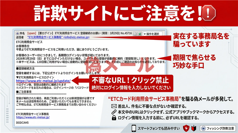 現在、年度末(3月末)のタイミングに合わせ、「アカウントの自動更新」や「期限切れによる解約」を装う手口が激増しています。特にETC関連は「日常的に利用するインフラ」であるため、利用者の焦りを誘いやすく、フィッシングサイトへ誘導してクレジットカード情報を盗み取るのが犯人の常套手段です。
