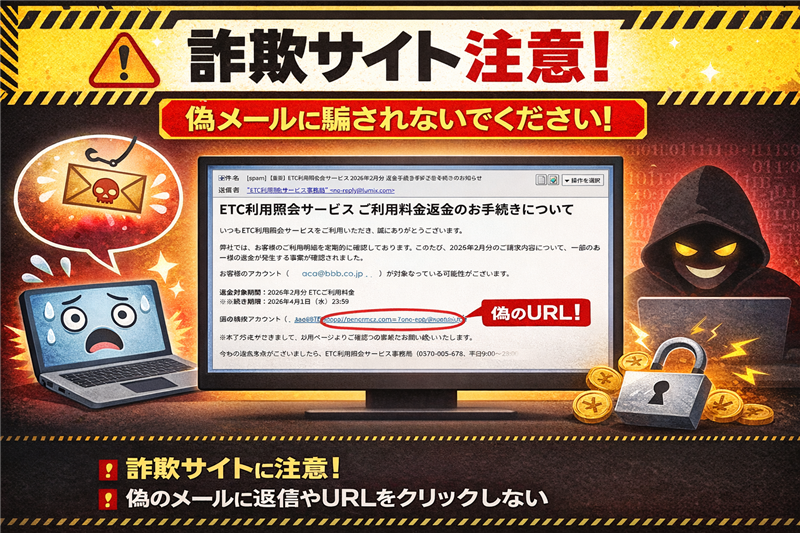【調査報告】最新の詐欺メール解析レポート ETC利用照会サービスを騙るなりすましメール | ■ 最近のスパム動向 今回ご紹介するのは「ETC利用照会サービス」を騙るメールですが、その前に最近のスパムの動向を。現在、時節柄、ETCの利用が増える時期を狙った詐欺や、年度末・新生活に関連した各種インフラ(電力、通信、税務署)を装った「返金手続き」や「アカウント更新」の通知が急増しています。不特定多数に送りつけ、焦りを利用して偽のサイトへ誘導する手口が横行しており、注意が必要です。