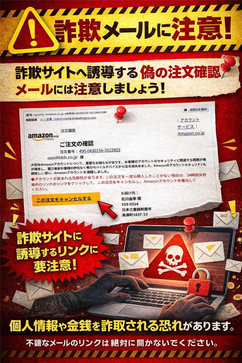 【調査報告】最新の詐欺メール解析レポート メールの解析結果:Amazonを騙る偽の注文確認通知 | 最近のスパム動向 今回ご紹介するのは「Amazon」を騙るメールですが、その前に最近のスパムの動向を解説します。3月下旬は新生活に伴う買い物や配送が急増する時期であり、そこを狙った「偽の注文確認」や「アカウント凍結」を装った攻撃が多発しています。特に、実在しそうな住所や氏名を本文に組み込み、受信者を「自分ではない誰かが自分のカードで買い物をした」と錯覚させる心理的手口が目立ちます。 基本受信情報 | 件名: | [spam] Amazon.co.jpでのご注文490-0430156-3522803 | | 件名の見出し: | [spam]の表記は、メールサーバーが過去の詐欺パターンや送信元の信頼性を自動解析し、危険と判定した証拠です。 | | 送信者: | “自動配信メール” <info@mail38.chatgptlogins.com> | | 受信日時: | 2026-03-31 5:38 | | 送信者情報: | 送信者のドメインが「chatgptlogins.com」であり、Amazon公式とは一切無関係です。また宛名が「aaa@bbb.co.jp 様」と受信者のアドレスになっているのは、犯人が氏名を把握していないためです。 | | メール本文の再現(解析対象) | ※できる限り忠実に再現していますが、本物の詐欺メールとデザインが異なる場合もあります。 | アカウントサービス | Amazon.co.jp  注文履歴 ご注文の確認 注文番号:490-0430156-3522803 aaa@bbb.co.jp 様 大切なAmazonアカウントについて、重要なお知らせがあります。お客様のアカウントのセキュリティに関連する問題が発生し、第三者がお客様の許可なく他のモバイルデバイスから注文を試みました。Amazonのアカウントセキュリティポリシーに従い、Amazonアカウントを凍結しました。 ◆アカウントが盗まれる危険性があります。この注文を一度も購入したことがない場合は、24時間以内に以下のリンクをクリックして、この注文をキャンセルし、Amazonアカウントを復元してください。 お届け予定:火曜日, 03/31 お届け先:北川由季 様 519-0314 日本三重県鈴鹿市長澤町1637-13 配送オプション:お急ぎ便 注文合計:¥21,000 支払い方法:クレジットカード : ¥21,000 Amazon.co.jp でのご注文について、くわしくは注文についてのヘルプページをご確認ください。 …(中略)… またのご利用をお待ちしております。 Amazon.co.jp | 専門家による解析レポート ■ 犯人の目的とメールのデザイン 犯人の目的は、偽の注文を「キャンセルさせる」という名目で、受信者のAmazonログイン情報とクレジットカード情報を盗み出すこと(フィッシング)です。Amazon公式ロゴや注文確認の定型文を完全にコピーしており、非常に精巧なデザインとなっています。ロゴを添付ファイルにせず、画像URLとして読み込ませることで、メールの受信制限を回避しようとする意図も見られます。 ■ 怪しい点と注意喚起 最大の矛盾点は、宛名が名前ではなく「メールアドレス」になっている点です。Amazon公式が顧客をメールアドレスで呼ぶことはありません。また、お届け先の「北川由季」という人物は、受信者の不安を煽るための架空のデータです。 Amazon公式:ヘルプページ(詐欺メールの見分け方) ≫ | 送信元(Received)回線関連情報 この情報は送信に利用された記録であり、カッコ内のIPアドレスは信頼できる送信元データです。 | Received(送信者)ドメイン: | mail38.chatgptlogins.com | | Received(送信者)IP: | 34.84.28.181 | | ホスティング社: | Google Cloud (Google LLC) | | 設置国名: | 日本 (Japan) | | ドメイン登録日: | 2026-03-10(攻撃開始の直前に取得された極めて新しいドメイン) | 本レポートの根拠データ(ip-sc.net) ≫ | リンク先(詐欺サイト)の徹底解析 | リンク付け箇所: | 「この注文をキャンセルする」ボタン | | 誘導先URL: | https://zh-wap-uqi●●●orts.com/amazon-ap-jp/(※伏字あり) | | セキュリティ警告: | ウイルスバスターにて「フィッシング詐欺サイト」として警告・ブロックを確認。 | | サイトの状態: | 現在「Timeout Error」となりアクセス不能。短期間で閉鎖された可能性があります。 | ■ リンク先ドメイン・回線情報 | リンク先IPアドレス: | 104.21.31.200 | | リンク先ホスト名: | zh-wap-uqiusports.com | | ホスティング社: | Cloudflare, Inc. | | 設置国名: | アメリカ合衆国 (United States) | | ドメイン取得日: | 2026-03-20(攻撃の10日前に取得。使い捨てドメインの特徴です) | 本レポートの根拠データ(ip-sc.net/104.21.31.200) ≫ | 詐欺サイトの検証画像 【リンク先で表示されたエラー画面】 | Sorry, your request timed out. Please try again or check your internet connection. | ※現在はサイトがタイムアウトしており、痕跡を消去しようとしている様子が伺えます。 | まとめと対処法 本件はAmazonを装っていますが、中身は完全な偽物です。過去の事例と比較しても「注文キャンセル」をトリガーにする手法は非常に成約率(被害率)が高く注意が必要です。もしリンクを踏んでしまっても、何も入力せずにページを閉じてください。既に情報を入力した場合は、即座にカード会社へ連絡し、Amazonのパスワードを変更してください。 Amazon公式サイトの注意喚起を再