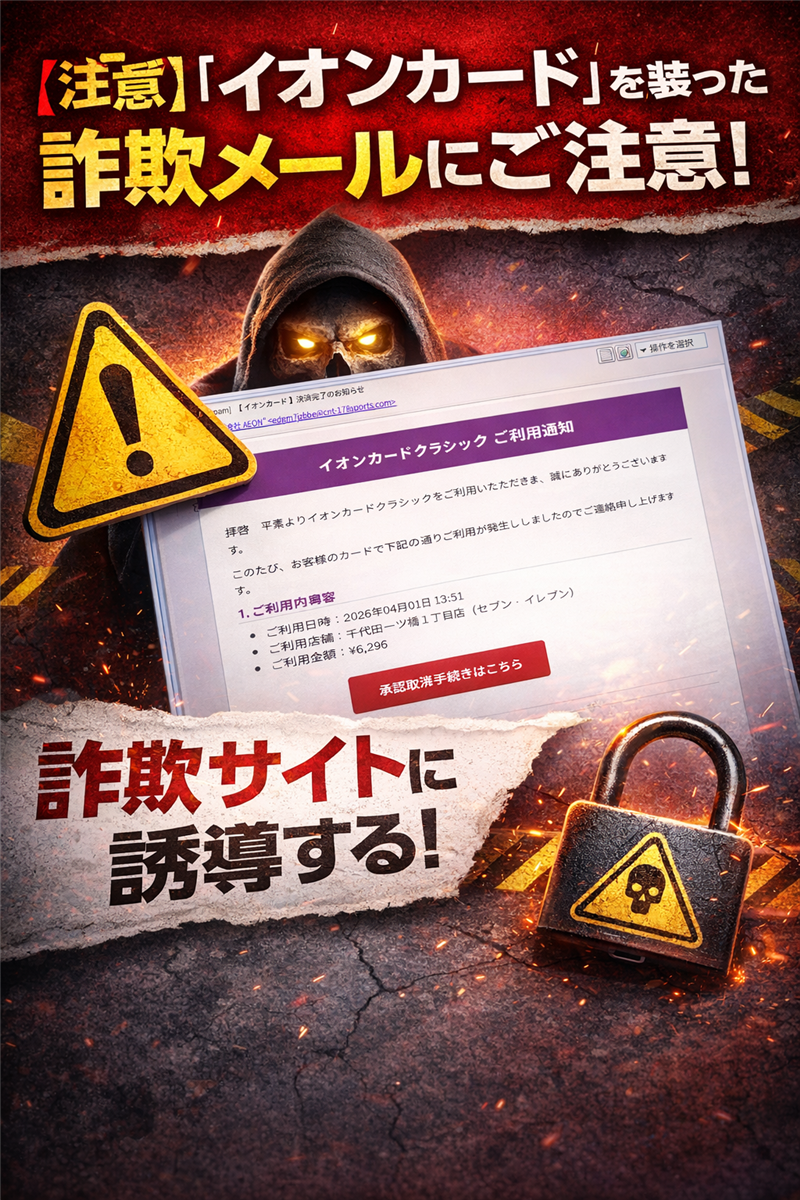 【調査報告】最新の詐欺メール解析レポート 解析対象:イオンカード詐欺メールおよびフィッシングサイト(2026年4月版) | 最近のスパム動向 今回ご紹介するのは「イオンカード」を騙るメールですが、その前に最近のスパムの動向を解説します。現在は、単に偽サイトへ誘導するだけでなく、正規のクラウドサービス(Google Cloud等)を送信基盤に悪用し、セキュリティフィルターを回避する手法が主流となっています。特にカードの「決済完了」を装い、利用者の「身に覚えがない」という心理的な隙を突く手口が極めて巧妙化しています。 | メール受信情報の解析 | 件名 | [spam] 【イオンカード】決済完了のお知らせ | | 見出しの[spam] | サーバー側で「送信ドメイン認証(SPF/DKIM)」の不整合を検知したため自動付与されています。 | | 送信者 | “株式会社 AEON” <edgm7jzbbe@cnt-178sports.com> | | 受信日時 | 2026-04-01 13:15 | 送信者に関する情報 送信ドメイン「cnt-178sports.com」はイオンカードとは無関係なスポーツ系関連ドメインを装っています。正規ドメイン(aeon.co.jp)とは一文字も一致しません。 | メール本文の忠実再現 ※できる限り忠実に再現していますが、本物の詐欺メールとデザインが異なる場合もあります。 | イオンカードクラシック ご利用通知 拝啓 平素よりイオンカードクラシックをご利用いただき、誠にありがとうございます。 このたび、お客様のカードで下記の通りご利用が発生しましたのでご連絡申し上げます。 1. ご利用内容 ・ご利用日時:2026年04月01日 13:51 ・ご利用店舗:千代田一ツ橋1丁目店(セブン-イレブン) ・ご利用金額:¥6,296 2. お心当たりのない場合 万一、身に覚えのないご利用である場合は、速やかに承認を取り消し手続きをお願いいたします。該当のリンクよりログインのうえ、画面の案内に従ってください。 https://support.fixz●●●.cfd/login 3. 手続き方法 ・上記リンクをクリックし、イオンNET会員ページへログイン 4. ご注意事項 ・本メールに心当たりのない場合は、当社コールセンターまでご連絡ください。 ※本メールは送信専用です。ご返信いただいても対応いたしかねます。 今後ともイオンカードクラシックをどうぞよろしくお願い申し上げます。 敬具 ■発行者:株式会社イオン銀行 ■業務受託会社:イオンフィナンシャルサービス株式会社 | | 解析結果と犯人の目的 犯人の目的 「不正利用の疑い」を口実に、偽のログイン画面(フィッシングサイト)へ誘導し、イオンスクエアメンバーID、パスワード、およびカード番号(セキュリティコードを含む)を盗み出すことが唯一の目的です。 専門的解説とおかしな点 メール本文に「千代田一ツ橋1丁目店」という具体的な架空の利用店舗名を出すことで、リアリティを演出しています。しかし、イオンカードがこのような少額決済(6,296円)で即座にメール通知を行い、ボタン一つで「承認取消し」をさせる仕組みは存在しません。また、画像内のフッターに記載されている発行者情報等には電話番号が記載されていませんが、もし不自然な番号がある場合は、公式サイトの番号(0570-071-090等)と照合し、一致しない場合は詐欺確定と判断できます。 | メール回線関連情報(送信元) | Receivedヘッダー | from infoo1.cnt-178sports.com (unknown [168.93.199.31]) | | 送信元IPアドレス | 168.93.199.31 (カッコ内のIPは信頼できる証跡情報です) | | ホスティング社名 | Cloudflare, Inc. (または関連プロバイダ) | | 設置国 | United States (アメリカ合衆国) | | ドメイン登録日 | 取得から日が浅い(直近数ヶ月以内)。短期間で使い捨てるための登録と推測されます。 | | リンク先(詐欺サイト)の徹底解析 | 誘導URL | https://support.fixz●●●.cfd/login (伏字あり/リンク無効化) | | リンクドメインIP | 104.21.31.218 (伏字なしの生情報) | | ホスティング社名 | CLOUDFLARENET | | 設置国 | United States (アメリカ合衆国) | | ドメイン登録日 | 2026年3月末。攻撃開始直前に「.cfd」ドメインを取得しています。 | サイト回線関連情報 このドメイン「support.fixzeno.cfd」は、WHOIS情報によると登録者が秘匿されており、登録からわずか数日で攻撃に投入されています。これはフィッシング詐欺の典型的なパターンです。 | 詐欺サイトの検証(実例画像) 【警告】以下のページは本物そっくりに作られた偽物です  偽物を見抜くポイント 1. URLの確認:画面上部(ブラウザのアドレスバー)が「aeon.co.jp」ではなく、前述の「.cfd」等になっている。 2. リンクの死に体:本物のページなら動くはずの「新規登録」や「パスワードをお忘れの方」などのボタンが反応しない、あるいはすべて同じ入力フォームへ飛ばされる。 3. 不自然なフォント:一部に中国語圏のフォント(簡体字)が混じっている場合があります。 | まとめと対策 過去の事例と比較しても、今回のイオンカード偽装メールは「決済完了通知」という非常に反応しやすいタイトルを選んでいます。不審なメールを受け取った際は、メール内のリンクは絶対に触らず、ブックマークした公式ページや公式アプリからログイン