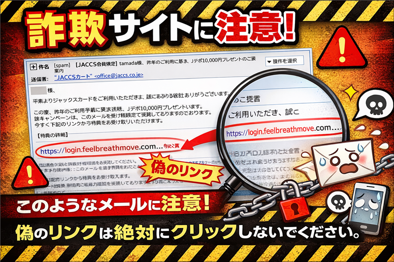 【対処】 ジャックスの公式注意喚起ページ(https://www.jaccs.co.jp/service/information/phishing/)を必ず確認し、不審なメールは即削除してください。