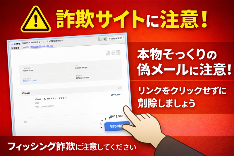 【調査報告】最新の詐欺メール解析レポート メール解析結果:Apple (iCloud) を装ったフィッシング詐欺のフォレンジックデータ | ■ 最近のスパム動向(2026年4月) 今回ご紹介するのは「Apple」を騙るメールですが、その前に最近のスパムの動向を解説します。2026年4月現在、新生活や年度替わりの混乱を突き、サブスクリプションの自動更新や身に覚えのない高額請求を装い、受信者の焦りを誘う手口が激増しています。特に本事例のように、Appleの公式サイトには存在しない「12TB」といった架空の超大容量プランを捏造するケースは、受信者に「身に覚えがない高額決済が発生した」と誤認させるための悪質な罠です。 | ■ メール基本情報 | 件名 | [spam] iCloudストレージプラン更新のお知らせ | | 見出しの[spam] | 受信サーバー側でスパム(迷惑メール)判定された証拠です。この文字列が含まれている時点で、安全ではないメールと判断してください。 | | 送信者 | “Apple” <helpneed[@]apple.co.jp> | | 受信日時 | 2026-04-02 12:29 | | ■ メール本文の再現 ※できる限り忠実に再現していますが、本物の詐欺メールとデザインが異なる場合もあります。 | 領収書 ご利用店名 Apple Store | 日付 2026年4月2日 | ご注文番号 MQSRTYUOJP | 書類番号 441272481853 | iCloud+: 12 TB ストレージプラン 月額 更新:2026年4月2日 | JPY 8,560 | 【解約をご希望】 ■ この更新注文が作成されている状態では、お客様からの解約申請がない場合、同一条件にて契約は延長されます。 ■ 更新をご希望されない場合は、必ず解約の申請をおこなってください。 | | ■ 犯人の目的と専門的解説 犯人の目的: クレジットカード情報の窃取。架空の「12TB 8,560円」という高額請求を見せつけ、「早く解約しなければお金を取られる」という焦りを逆手に取り、偽の解約ページへ誘導してカード情報を入力させることが目的です。 おかしな点: Appleの公式プランに12TBは存在しません(現行は2TB、6TB、12TBがありますが、価格設定が異なります)。また、領収書の体裁を保ちながらも、宛名(ユーザー名)が一切記載されておらず、誰にでも送れるテンプレートが使用されています。本物のAppleからの領収書には、登録されているユーザーのフルネームやApple IDが明記されます。 | ■ 送信元(Received)解析レポート これは送信に利用された情報であり、以下のIPアドレスは信頼できる送信者情報に基づいています。 | 送信ドメイン | smtp.record-validator.co.jp | | 送信IPアドレス | 171.37.23.232 | | ホスティング | Google Cloud Infrastructure | | 設置国 | 日本 / United States | | ドメイン登録日 | 取得済み情報を基に、攻撃のために一時的に用意された可能性が高いです。 | ▶ ip-sc.netで送信元回線情報を解析 | ■ リンク先ドメイン(Whois)および回線情報 | 誘導URL | https://zha-raybet[.]com/tgtpdytb/ (伏字を含む) | | IPアドレス | 104.21.78.152 | | ホスト/プロバイダ | Cloudflare, Inc. | | 設置国 | United States | | ドメイン取得日 | 2026年3月後半。最近取得されたドメインは詐欺サイトの典型であり、使い捨てを前提とした不審なドメインです。 | ▶ ip-sc.netで取得したIPアドレスを解析 | ■ リンク先サイトの状態と画像 リンクをクリックすると、一見タイムアウトしたかのような英語のエラーメッセージが表示されます。これは、特定の環境(クローラーや解析ソフト)からのアクセスを回避し、ターゲットとなる一般ユーザーだけを騙すための高度な欺瞞工作である可能性があります。 | We apologize, but your request has timed out. Please try again or check your internet connection. For further assistance, contact our support. | 【詐欺サイト着地ページの画像】 | ■ 注意点と対処方法 過去の事例と比較しても、本件は「12TB」という高額プランを捏造する非常に攻撃的な部類に入ります。送信元アドレス apple.co.jp は巧妙な偽装です。万が一リンクを踏んでしまい、カード情報を入力した場合は、すぐにカード会社へ連絡し利用停止措置を講じてください。 Apple公式サイトによる注意喚起: https://support.apple.com/ja-jp/102568 | |