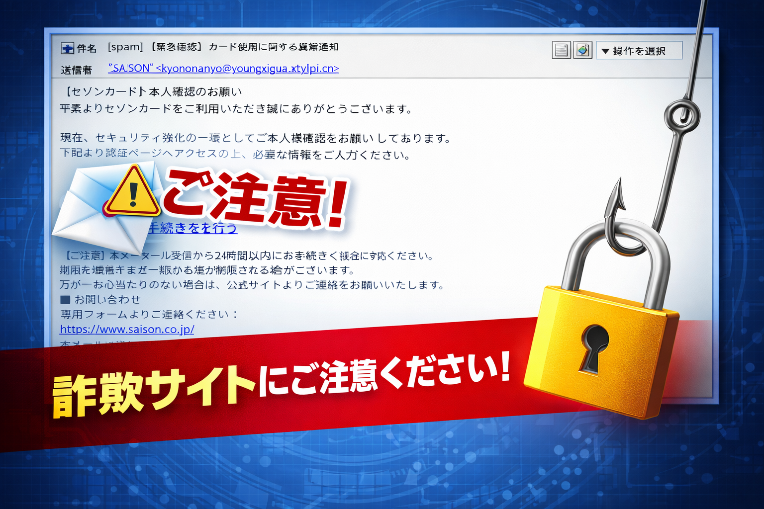【調査報告】最新の詐欺メール解析レポート | 今回ご紹介するのは「セゾンカード」を騙るメールですが、その前に最近のスパムの動向を解説します。2026年4月に入り、新生活の決済確認を装ったフィッシング詐欺が急増しています。特に週末の深夜から早朝(3:10など)を狙い、ユーザーの判断力が鈍る時間帯に大量送信を行う傾向が顕著です。これらは「使い捨てドメイン」を悪用した組織的な犯行です。 | メール基本情報 件名:[spam] 【緊急確認】カード使用に関する異常通知 見出しの理由:件名の[spam]は、サーバー側が送信元ドメイン(.cn)やSPF/DKIM認証の不一致を検知し、自動付与した警告ラベルです。 送信者:“SAISON” <kyononanyo@youngxigua.xtylpi.cn> 受信日時:2026-04-04 03:10 | 送信者に関する情報 | 送信元アドレスのドメイン「youngxigua.xtylpi.cn」は中国のccTLD(.cn)であり、セゾンカード公式サイトとは何の関係もありません。送信者名に”SAISON”を掲げていますが、メールアドレス自体がランダムな英数字の羅列であり、典型的な使い捨て攻撃用アカウントです。 | メール本文(再現) | ※できる限り忠実に再現していますが、本物の詐欺メールとデザインが異なる場合もあります。 【セゾンカード】本人確認のお願い 平素よりセゾンカードをご利用いただき誠にありがとうございます。 現在、セキュリティ強化の一環としてご本人様確認をお願いしております。 下記より認証ページへアクセスの上、必要な情報をご入力ください。 🔒 認証手続きを行う 【ご注意】本メール受信から24時間以内にお手続きください。 期限を過ぎますと一部機能が制限される場合がございます。 万が一お心当たりのない場合は、公式サイトよりご連絡をお願いいたします。 ■ お問い合わせ 専用フォームよりご連絡ください: https://www.saison.co.jp.●●●.cn/ 本メールは送信専用です。返信には対応しておりません。 © 2025 SAISON CARD Co., Ltd. All rights reserved. | 専門的なメール解析と目的 | 犯人の目的:カード番号、有効期限、セキュリティコード、およびNetアンサーのログイン情報を盗み取ることです。 解析コメント:このメールには署名がなく、本来あるべきカスタマーサポートの電話番号や会社所在地が一切記載されていません。文字ばかりの構成は、画像を多用するとスパムフィルタに弾かれやすくなるため、それを回避する意図があります。宛名が「お客様」すらなく無記名である点も、不特定多数へバラまいている証拠です。 | これは送信に利用した情報であり、カッコ内のIPアドレスは偽装困難な信頼できる送信者情報です。 Received: from youngxigua.xtylpi.cn (unknown [147.236.121.154]) 送信ドメイン:youngxigua.xtylpi.cn 送信IP:147.236.121.154 ホスティング:CHINANET-BACKBONE 国:China (中国) ドメイン登録日:2026-03-28 (攻撃開始のわずか数日前に取得) 回線解析データ:https://ip-sc.net/ja/r/147.236.121.154 | リンク先詳細解析 リンク箇所:「🔒 認証手続きを行う」およびテキスト表示のURL 誘導先URL:https://nqozie.cn/jw2/●●●/saisontiaos/ ブロック状況:Googleおよびセキュリティソフトによるブロックを確認 ドメイン:nqozie.cn リンク先IP:103.145.12.221 ホスティング:Cloudie Limited 国:Hong Kong (香港) 登録日:2026-04-01 (数日前に登録。攻撃に特化した即席ドメイン) 回線解析データ:https://ip-sc.net/ja/r/103.145.12.221 | リンク先サイトの状態 稼働状況:タイムアウトエラー(遮断済み) 「Sorry, your request timed out.」と表示され、現在は閲覧不可。警察やプロバイダによる凍結措置が取られた可能性があります。 【詐欺サイトの画像】  | まとめ・対処法 |