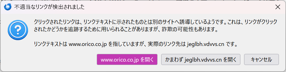 まとめと対処法 「eオリコ」を騙る今回のメールは、リニューアルという旬の話題を悪用した卑劣な手口です。過去の事例と同様、リンクテキストと実際の接続先が異なる点が最大の見抜きポイントです。 重要:不審なメールを受け取った際は、絶対にリンクをクリックせず、公式のブックマークやアプリからアクセスしてください。 【公式サイト】オリコを装った不審なメールへの注意喚起 |