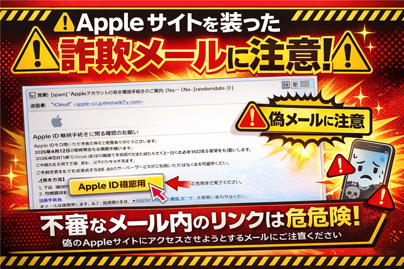 【調査報告】最新の詐欺メール解析レポート メールの解析結果: 本レポートは、Apple IDから「Apple Account」への名称変更という実例を悪用し、アカウント更新を迫るフィッシング詐欺の技術解析です。 | 1. 最近のスパム動向 今回ご紹介するのは「Apple」を騙るメールですが、その前に最近のスパムの動向を解説します。2026年に入り、Apple IDが「Apple Account」へと正式にリブランドされたタイミングを突いた詐欺が急増しています。ユーザーが「名称変更に伴う手続きが必要」と思い込みやすい心理的隙を突く、非常に時節に沿った巧妙な手口です。 2. ターゲットメール基本情報 | 件名 | [spam] “Appleアカウントの安全確認手続きのご案内(No.-[-randomdate-]) | | 件名の見出し | 冒頭の[spam]は、サーバーの検知システムが送信ドメイン認証の失敗やスパム特有の振る舞いを検出したため付与されています。 | | 送信者 | “iCloud” <apple-co.jp@emailq6Ty.com> | | 受信日時 | 2026-04-07 9:09 | 送信者に関する情報 送信者アドレスのドメイン「emailq6Ty.com」はAppleとは無関係なランダムな文字列です。表示名を「iCloud」に、メールアドレスのローカル部分を「apple-co.jp」に設定することで、スマートフォン等の簡易表示で公式に見せかける工作がされています。 3. メール本文の解析(再現) |  Apple ID 継続手続きに関するご確認のお願い Apple IDをご利用いただきありがとうございます。 2026年4月12日にApple IDの継続手続きが必要です。 下記の内容をご確認いただき、引き続きサービスをご利用いただくために必要な対応をお願いいたします。 ご対応期限:2026年4月12日 継続手続きが完了していない場合、Apple IDの一部サービスがご利用いただけなくなる可能性がありますのでご注意ください。 ご登録内容の確認・更新は、以下のボタンから行えます。 【手続き方法】 1. 下記「継続手続き」ボタンを押してください。 2. Apple IDでサインインし、画面の案内に従って手続きを完了してください。 継続手続き ご不明な点がございましたら、Appleサポートまでお問い合わせください。 | 本メールは送信専用です。ご返信いただいてもお答えできませんのでご了承ください。 Apple Inc. All rights reserved. Apple ID © 2025 Apple Inc. All rights reserved. | ※できる限り忠実に再現していますが、本物の詐欺メールとデザインが異なる場合もあります。 メールの目的及び感想 【犯人の目的】Apple Account(旧Apple ID)のログイン資格情報および、決済カード情報の窃取です。 【解析感想】本文の末尾数行が水色(#dbeafe)の背景になっているのは、近年のフィッシングメールで非常に多く見られる共通のテンプレートです。Appleのロゴは画像として挿入されており、視覚的な安心感を与える狙いがあります。Apple IDからApple Accountへの移行期を狙った非常に質の悪い攻撃です。 4. 危険なポイントと対処法 ●送信アドレスの偽装:公式のアドレス「appleid@id.apple.com」等とは全く異なるドメインです。 ●緊急性の強調:4月12日という具体的な期限を設け、ユーザーを心理的に追い込んでいます。 ●公式サイトの注意喚起:Appleはフィッシングに関する専用のサポートページを公開しています。 Apple公式:フィッシングメールを識別する 5. 送信元の回線関連情報 | Received (送信元情報) | from p74776-shiga791.shiga.nifty.com (unknown [45.142.155.42]) | | 送信元IPアドレス | 45.142.155.42(信頼できる実効データ) | | ホスト名 | p74776-shiga791.shiga.nifty.com | | ホスティング社名 | Nifty Corporation (ニフティ) | | 国名 | Japan (日本) | 6. 誘導先リンク・ドメインの解析 | 誘導先URL | https://audiecapote.sh●p/%F0%9D%90%A2%F0%9D%90%A7%F0%9D%90%9D…(一部伏字) | | セキュリティ状態 | AdGuardによりフィッシングサイトとしてブロックを確認済み | サイト回線関連情報 |
