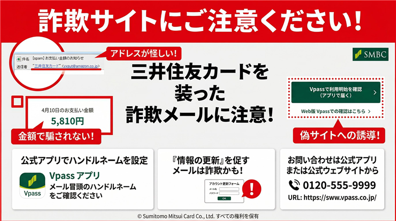 過去の事例と比較しても、金額やポイント数を具体的に提示する手法は「クリック率」を高めるための常套手段です。三井住友カード公式でも同様の詐欺に対する強い注意喚起が出ています。