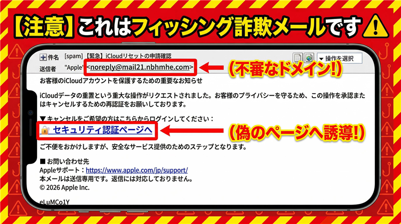 【調査報告】最新の詐欺メール解析レポート メールの解析結果:iCloudアカウント保護を装うフィッシング詐欺 | 最近のスパム動向と手口の巧妙化 今回ご紹介するのは「Apple」を騙るメールですが、その前に最近のスパムの動向について解説します。 2026年4月現在、新生活に伴うデバイスの新規設定や、年度末から続くサブスクリプション更新の時期を狙い、「iCloudのストレージ」「アカウントのリセット」を口実にした詐欺が激増しています。 特に本事例のように「重畳(じゅうじょう)」といった難解な用語を使い、ユーザーに「何か難しいトラブルが起きている」と錯覚させ、冷静な判断を奪う手法が目立ちます。 | ■ 受信メール解析データ | | 件名 | [spam] 【緊急】iCloudリセットの申請確認 | | 件名の見出し | [spam] 判定の理由 送信ドメイン認証(SPF/DKIM)の失敗、および送信元IPアドレスがブラックリストに登録されているため、サーバー側で自動付与されています。 | | 送信者 | “Apple” <noreply@mail21.nbhmhe.com> | | 受信日時 | 2026-04-08 15:11 | 送信者に関する情報の分析 表示名は「Apple」ですが、ドメイン「nbhmhe.com」はApple公式とは無関係の使い捨てドメインです。公式からの通知であれば、必ず「@apple.com」や「@email.apple.com」といった正規ドメインから送信されます。 | ■ メール本文の忠実な再現(解析用) | ※できる限り忠実に再現していますが、本物の詐欺メールとデザインが異なる場合もあります。 お客様のiCloudアカウントを保護するための重要なお知らせ iCloudデータの重畳という重大な操作がリクエストされました。お客様のプライバシーを守るため、この操作を承認またはキャンセルするための再認証をお願いしております。 ▼ キャンセルをご希望の方はこちらからログインしてください: 🔐 セキュリティ認証ページへ(h**ps://apple.account-auth.verification-service.xyz/) ご不便をおかけしますが、安全なサービス提供のためのステップとなります。 ■ お問い合わせ先 Appleサポート:h**ps://www.apple.com/jp/support/ 本メールは送信専用です。返信には対応しておりません。 © 2026 Apple Inc. eLUMCo1Y | メールの目的と専門的考察 犯人の目的:「Apple ID」と「パスワード」の窃取、およびその後に続く「二段階認証コード」や「クレジットカード情報」の奪取を目的としています。 専門的見解:本文に「Appleサポート」のURLを記載して信頼感を出そうとしていますが、正規のAppleメールにあるべき「宛名(お客様のフルネーム)」や、問い合わせ用の公式電話番号(0120-277-535等)を含む「正しい署名」が一切ありません。文字ばかりで公式ロゴもなく、非常に安価に作成されたスパムと言えます。末尾の「eLUMCo1Y」はフィルター回避用の乱数です。 | ■ Received (送信者情報) 解析 | | 解析の根拠 | 送信に利用されたヘッダー情報であり、以下のIPアドレスは信頼できる送信元の特定データです。 | | 送信元ドメイン | mail21.nbhmhe.com(偽装確定) | | 送信元IPアドレス | 35.194.109.116 | | ホスティング/国 | Google Cloud (bc.googleusercontent.com) / United States | | ドメイン登録日 | 最近登録(Whois参照) | リンク先ドメイン・回線の詳細解析 | 誘導先URL | h**ps://jpjckkzlmtbl.top/jp (※伏字を含む) | | 判定結果 | ウイルスバスターおよびGoogleにより「危険なサイト」としてブロック確認 | | IPアドレス | 104.21.32.204 | | ホスト名 | Cloudflare, Inc. (AS13335) | | 設置国 | United States (アメリカ合衆国) | | ドメイン取得日 | 2026年3月末〜4月(直近) 攻撃開始の直前に取得されています。これは追跡を逃れるための使い捨てドメイン特有の動きです。 | 誘導先詐欺サイトの視覚的検証(稼働中)  正規のApple IDログイン画面を完全にコピーした偽ページです。URLが「jpjckkzlmtbl.top」という無意味な文字列である点が、偽物を見抜く最大のポイントです。 危険なポイントと推奨される対処法 1. 送信元アドレスの確認: 表示名ではなく「@」以降を確認。Appleが「nbhmhe.com」を使うことはありません。 2. リンクの不整合: 本文内の「セキュリティ認証」リンクが「.top」ドメインへ誘導される点は致命的な不審点です。 3. 宛名の欠如: 本物の重要通知には必ず登録されたフルネームが記載されます。 対処法:このメールは無視して即座に削除してください。万が一リンクを開いても、Apple IDや個人情報は絶対に入力しないでください。 | | Apple公式による注意喚起も合わせてご確認ください: | |