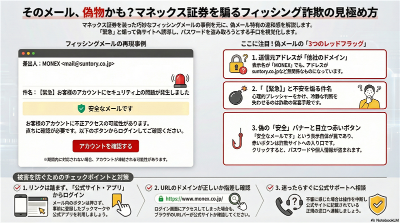 今回ご紹介するのは「マネックス証券」を騙るメールですが、その前に最近のスパムの動向を解説します。最近は、従来のパスワード窃取に加え「パスキー」の登録確認を促す手口が急増しています。これは二要素認証の突破を狙う極めて危険な攻撃です。