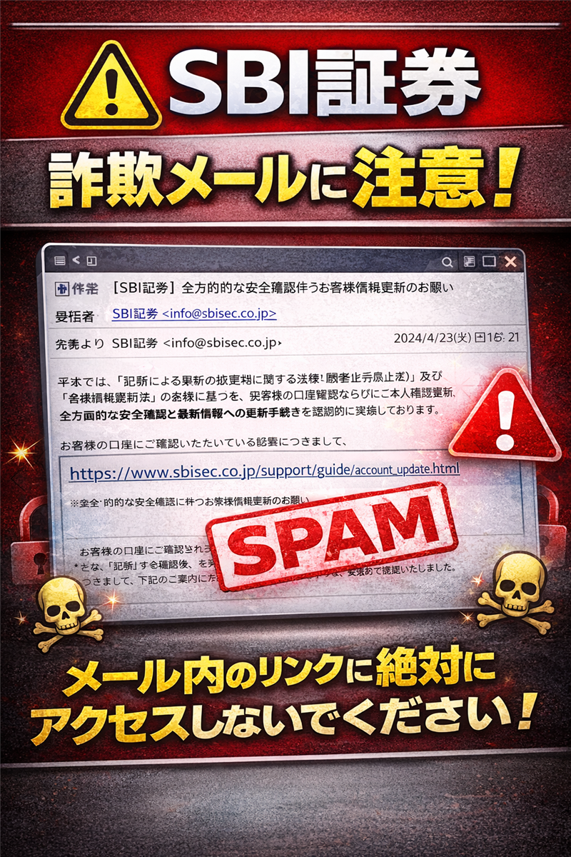 【調査報告】最新の詐欺メール解析レポート 解析対象:SBI証券を騙るフィッシング詐欺メール | ■ 最近のスパム動向 今回ご紹介するのは「SBI証券」を騙るメールですが、その前に最近のスパムの動向を解説します。昨今、改正法や金融庁のガイドラインを盾に「全方面的な安全確認」や「定期的な情報更新」を迫る手口が定着しています。特に、実在する公式ドメイン(sbisec.co.jp)を表示名に使い、視覚的に信頼させる手法が目立ちます。 | ■ メール受信情報 件名:[spam] 【SBI証券】全方面的な安全確認に伴うお客様情報更新のお願い 送信者:“SBI証券” <info@sbisec.co.jp> 受信日時:2026-04-09 9:47 ※[spam]の見出しは、サーバーが送信経路の不自然さを検知し、自動的に危険性を警告している証拠です。