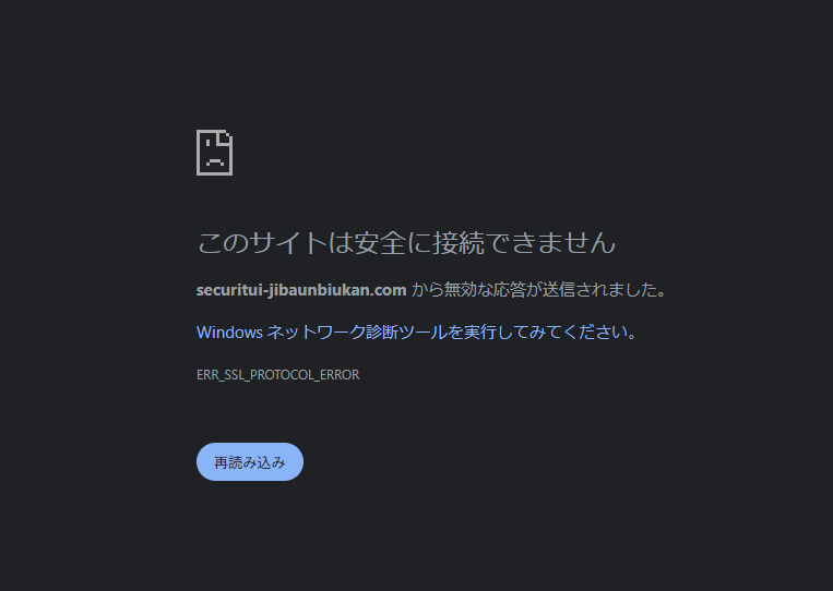 現在、ブラウザからは「このサイトは安全に接続できません(ERR_SSL_PROTOCOL_ERROR)」と表示されます。これは、詐欺サイトのSSL証明書設定が不完全であるか、既に通報によりサーバーが遮断され始めている状態を示していますが、「稼働中」と判断し警戒を緩めないでください。