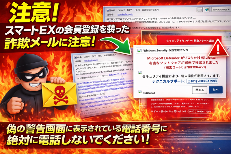 最近の傾向として、入り口は「鉄道系(スマートEX)」で安心させ、クリック後の最終着地点では「マイクロソフト(システム警告)」にすり替える「ブランドスイッチ」戦術が目立ちます。これにより、移動中の焦りを利用しつつ、PCやスマホの全権を掌握しようとするサポート詐欺へと繋げます。