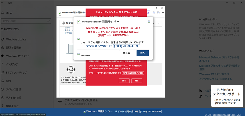 偽の電話番号: 画面内の「(0101) 20836-17998」はMicrosoftの公式番号ではありません。国際電話形式を装っていますが、実態は攻撃者に繋がるIP電話です。