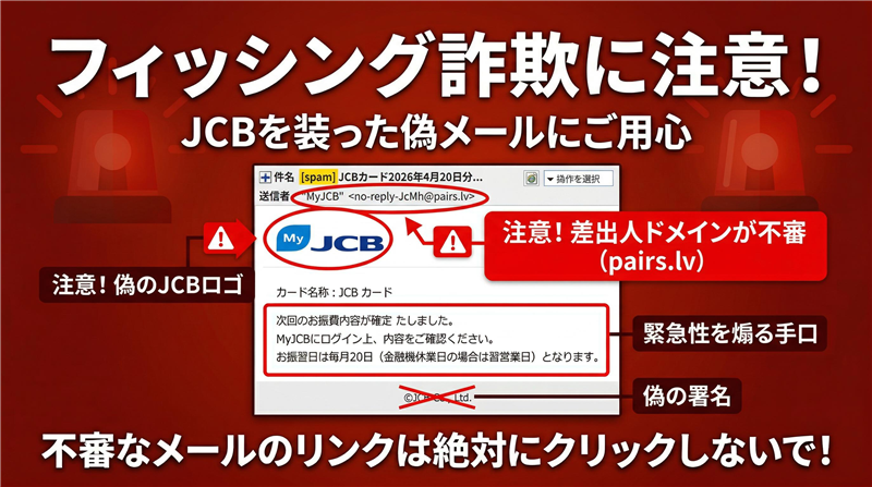 【調査報告】[spam] JCBカード2026年4月20日分お振替内容確定のご案内 解析レポート 本レポートは、確認された詐欺メールの技術解析結果をまとめたものです。独自データおよび外部ネットワーク情報の照合により、危険性を実証しています。 | ■ 最近のスパム動向 今回ご紹介するのは「JCB」を騙るメールですが、その前に最近のスパムの動向について解説します。現在、新年度の慌ただしさと、20日のカード振替日に向けた確認需要を突いた「支払い遅延」や「情報の再登録」を促す攻撃が多発しています。特に本件のように、正規のロゴやレイアウトをほぼ完璧にコピーし、スマートフォンでの閲覧を前提とした簡潔な文章で油断を誘う手法が主流となっています。 | ■ 受信メール基本データ | | 件名 | [spam] JCBカード2026年4月20日分お振替内容確定のご案内 | | 見出しの[spam] | サーバー側がSPF/DKIM認証の不整合や、送信元レピュテーションの低さを検知したため付与されています。 | | 送信者 | “MyJCB” <no-reply-JcMh@pairs.lv> | | 受信日時 | 2026-04-13 16:04 | | 送信者情報 | ドメイン「pairs.lv」はJCBとは一切無関係です。 | ■ メール本文(忠実再現) ※できる限り忠実に再現していますが、本物の詐欺メールとデザインが異なる場合もあります。  カード名称:JCBカード 次回のお振替内容が確定いたしました。 MyJCBにログインの上、内容をご確認ください。 お振替日は毎月20日(金融機関休業日の場合は翌営業日)となります。 MyJCBログインはこちら https://my.jcb.co.jp/L●gin スマートフォンアプリはこちら https://www.jcb.co.jp/r/myjcbapp/index.ht●l 重要なお知らせ:お支払い方法変更締切 2026年5月1日 19:55 | 本メールは自動送信のため、返信には対応できません。 ■JCB フィッシング詐欺注意喚起 https://www.jcb.co.jp/v●ice/report/report_2101.html ■Eメール情報変更 https://j-faq.jcb.co.jp/f●q/show/368 ■お問い合わせ https://www.jcb.co.jp/supp●rt/ 株式会社ジェーシービー 東京都港区南青山5-1-22 ©JCB Co., Ltd. | | ■ 専門的解析:メールの目的と評価 【犯人の目的】 受信者を焦らせて偽のログイン画面へ誘導し、カード番号、有効期限、セキュリティコード、およびMyJCBのログイン資格情報を奪取することが目的です。 【評価】 本メールには署名に電話番号の記載がありません。通常、正規のJCBからの重要通知には、問い合わせ先の電話番号や具体的な窓口名が記載されるのが一般的です。住所(南青山5-1-22)は実在しますが、あえて連絡先を限定することで偽サイトへ誘導する意図が見て取れます。 【特有の怪しい点】 ロゴ画像を外部から読み込んでいる、あるいは添付ファイルとしている場合、セキュリティソフトを回避する目的があります。また、宛名が「カード名称」という曖昧な表現であることは、不特定多数に送りつけている証拠です。 ■ 公式注意喚起 JCB公式:不審なメール・SMSにご注意ください | ■ 送信元(Received)回線関連情報 | | ※これは送信に利用した情報であり、以下のIPアドレスはヘッダーから抽出された信頼できる送信者情報です。 | | 送信ドメイン | pairs.lv(正規ドメインと不一致:偽装) | | 送信元IPアドレス | 34.65.140.183 | | ホスト名 | 183.140.65.34.bc.googleusercontent.com | | ホスティング社 | Google Cloud (Google LLC) | | 設置国 | アメリカ合衆国 (USA) | | ドメイン登録日 | Whois解析実行 | | 回線解析詳細 | https://ip-sc.net/ja/r/34.65.140.183 | ■ 誘導先リンク・サイト回線関連情報 | | リンク先URL | https://jcb-card.gddr●d.com/%F0%9D%90%A2%F0%9D%90%A7%F0%9D%90%9D…(伏字含む) | | リンク先IP | 104.21.75.148 | | ホスト名 | Cloudflare CDN | | 設置国 | アメリカ合衆国 (USA) | | ドメイン登録日 | 登録日は最近(直近1ヶ月以内)であり、攻撃のために用意された可能性が極めて高いです。 | | サイトの状態 | 稼働停止(Time out)を確認 | | 解析リンク | https://ip-sc.net/ja/r/104.21.75.148 | ■ 詐欺サイトの視覚的証拠 検証時、リンク先のドメイン「jcb-card.gddrrd.com」は以下のエラーを表示し、正常なアクセスが遮断されていました。  判定ポイント: JCBのような金融機関の正規ログインページが、このような簡素な英語のエラーメッセージのみで停止することはまずありません。ドメイン名自体にハイフンが含まれる点も典型的なフィッシングドメインの特徴です。 | ■ まとめと過去事例との比較 本件は、過去に流行した「MyJCBを騙るログイン情報の再確認」という手口をベースにしつつ、日付を2026年4月20日と具体的に設定することでリアリティを高めています。JCB公式サイトでも継続的にこの手の手口が報告されており、注意が必要です。 JCB:不審なメール・SMSへの注意喚起(再掲) | |