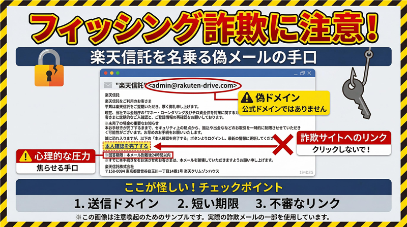 今回の事例は、メール送信元が「rakuten-drive.com」という、正規のファイル共有ドメインを悪用している点が非常に厄介です。しかし、信託業務の通知でこのドメインが使われることは「絶対に」ありません。不審な点があれば、メール内のリンクではなく、ブックマーク済みの公式サイトから状況を確認してください。