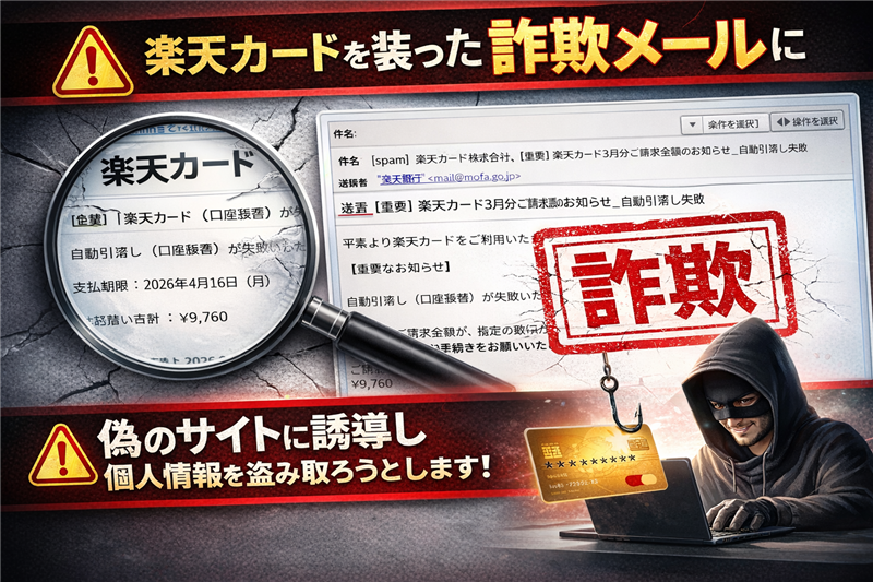 | 1. 楽天カードを装いつつ、外務省のメアドから届く異常事態! 2. 「PayPayで支払え」という案内は100%詐欺の証拠! 3. リンクは物理的に遮断し、公式アプリから確認を徹底! | | 【調査報告】最新の詐欺メール解析レポート | | 件名 | [spam] 楽天カード株式会社_【重要】楽天カード_3月分ご請求金額のお知らせ_自動引落し失敗. | | 件名の見出し | 冒頭の [spam] 表記は、メールサーバーが「送信元偽装」を検知した決定的な証拠です。この文字列がある時点で、内容はすべて嘘と判断して差し支えありません。 | | 送信者 | “楽天銀行” <mail@mofa.go.jp> | | 受信日時 | 2026-04-14 9:14 | 送信者に関する詳細解析 表示名は「楽天銀行」ですが、メールアドレスは「mofa.go.jp(日本の外務省)」となっており、表示名と中身が完全に矛盾しています。 ご覧の通り、このメールは公式サイトを装った真っ赤な偽物です。被害を未然に防ぐため、この解析結果を家族のLINEグループに転送して注意喚起してください。 | | ※できる限り忠実に再現していますが、本物の詐欺メールとデザインが異なる場合もあります。 楽天カード ご請求金額のお知らせ(2026年3月分) 平素より楽天カードをご利用いただき、誠にありがとうございます。 【重要なお知らせ】 自動引落し(口座振替)が失敗いたしました。 3月分のご請求金額が、指定の銀行口座より引き落とせませんでした。 至急のお支払い手続きをお願いいたします。 ご請求金額合計 ¥9,760 支払期限:2026年4月16日(月) お支払い方法について 自動引落しに失敗したため、PayPayでのお支払いをお願いいたします。 PayPayで今すぐ支払う ※このボタンをタップするとPayPay支払いページにジャンプします。 ※支払い期限を過ぎますと、遅延損害金が発生する場合がございます。 ※お支払い後、反映まで最大24時間かかる場合があります。 | ご不明な点がございましたら、楽天カードコンタクトセンターまでお問い合わせください。 電話番号:0570-66-6910(有料) | | ※本文の背景が白で末尾数行が水色の背景は詐欺メールで多く使われているテンプレートです。 メールの目的及び専門的考察 犯人の目的: クレジットカード情報の窃取ではなく、「PayPayマネー」による直接的な送金を狙っています。一度送金してしまうと取り消しが非常に困難であるため、極めて効率的な犯行を意図しています。 デザインの罠: 楽天カードのロゴやフォントを模倣していますが、そもそも楽天カードが支払いにPayPayを指定することはありません。また、末尾の電話番号「0570-66-6910」は公式のものですが、「本物の情報を一部混ぜる」ことで信頼させる巧妙な心理戦を展開しています。 | デジタル潜入調査:メールヘッダーの嘘を暴く 「自分の元に届いたメールが、実は海外のここから来ている」という事実に驚きを覚えるかもしれません。解析の結果、このメールは外務省からではなく、以下の海外サーバーを中継して放たれました。 Received: from mofa.go.jp (unknown [76.33.215.97]) ※これは送信に利用された生の情報であり、カッコ内のIPアドレスは偽装不可能な「真の送信元」です。 | | | 【本レポートの根拠】サイト回線関連情報 | | 送信元IPアドレス | 76.33.215.97 | | ホスティング社 | Google Cloud (bc.googleusercontent.com) | | サーバー設置国 | アメリカ合衆国 (USA) | | ドメイン登録状況 | mofa.go.jp自体は公的ドメインですが、このIPとの関連性はありません。なりすまし確定です。 | | >> ip-sc.net でこのIPの危険度エビデンスを閲覧する | | 潜入:詐欺サイトのリンク解析結果 | | リンク箇所 | PayPayで今すぐ支払う | | 偽装URL | https://paypay.ne.jp.auth-r****.com/(※伏字を含む。クリック厳禁) | | ブロック状況 | 現時点で一部のウイルス対策ソフトは未検知。PayPayのQRコード支払いページへ直接飛ばすため、非常に巧妙です。 | | サイト稼働状況 | 稼働中 | | 【最優先】身近な人が騙される前に共有を 「自分は大丈夫」と思っていても、焦っている時に届くこのデザインには誰しも騙される可能性があります。 身近な人が騙されてからでは手遅れです。この記事のURLをコピーして、家族のLINEグループで『これ気をつけて!』と共有してあげてください。 | |