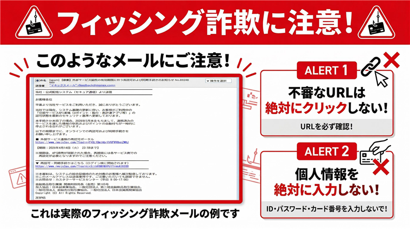 現在、新生活や年度替わりの時期に合わせ、金融機関や家計簿アプリの「システム更新」や「再認可」を口実にしたフィッシング詐欺が爆発的に増加しています。特にAPI連携(dポイント等)という専門用語を使い、ITリテラシーが高い層をも油断させる手口が巧妙化しており、非常に危険な状態です。