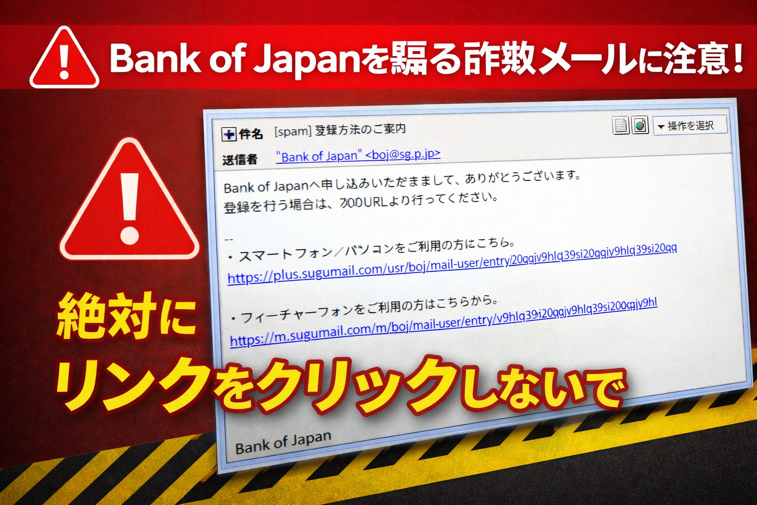 今回ご紹介するのは「日本銀行」を騙るメールですが、その前に最近のスパムの動向について。新年度の開始に伴い、公的機関の「利用登録」や「本人確認」を装う手口が激増しています。特に今回は、メールで安心させ、リンク先で「ウイルス感染」を装って電話をかけさせる、非常に悪質な『サポート詐欺』への踏み台となっています。